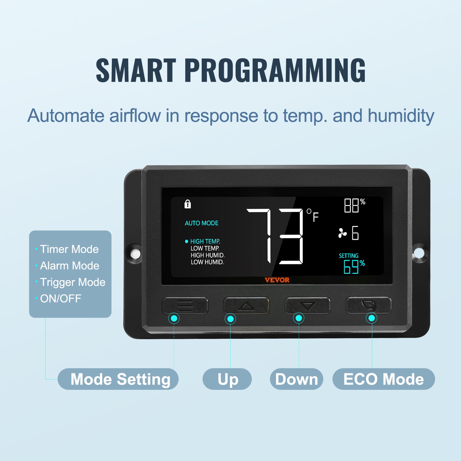 This wall-mounted exhaust fan is designed for ventilation and cooling in various spaces such as greenhouses, garages, sheds, and more. It features a high airflow capacity, adjustable speed, and a temperature and humidity controller to optimize indoor air quality and comfort.