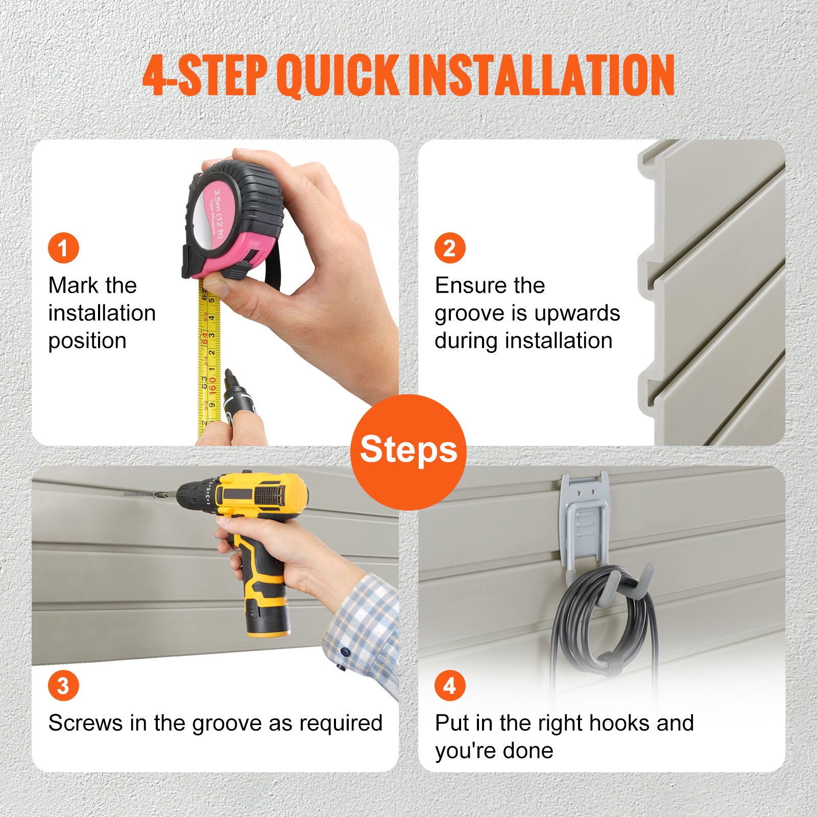 This set of heavy-duty wall panels is designed for versatile organization in retail stores, garages, and craft rooms. Made from durable WPC material, these panels are resistant to water and corrosion, ensuring long-lasting performance. The universal groove design allows for easy customization with various hooks and accessories, providing a sleek and clutter-free appearance. Simple to install, these panels can be set up in just a few steps and are suitable for a wide range of applications to optimize your space.