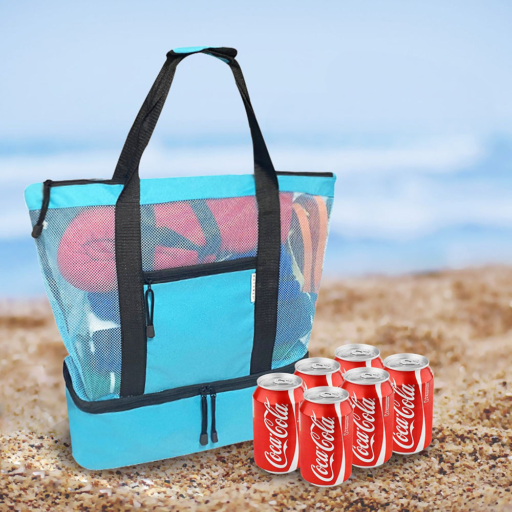 This 2 in 1 mesh beach tote bag with an insulated cooler is designed for convenience and versatility. It features a mesh lining and zipper closures for easy access to your items. The bag offers ample space for bottles, towels, and other essentials, with side pockets to hold sunscreens, mobile phones, sunglasses, and more. Made from high-quality materials, it keeps your drinks and snacks at the right temperature while remaining comfortable to carry.