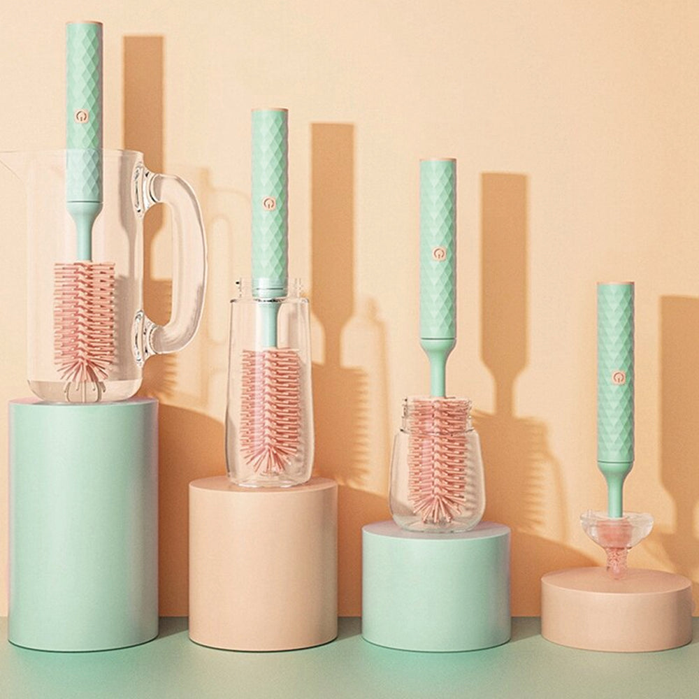 This is a handheld electric silicone bottle brush cleaner designed for efficient and gentle cleaning of bottles and cups. It features a rechargeable battery and a high-density silicone brush that rotates 360 degrees for thorough cleaning. The soft and elastic bristles ensure effective cleaning without damaging the surfaces.