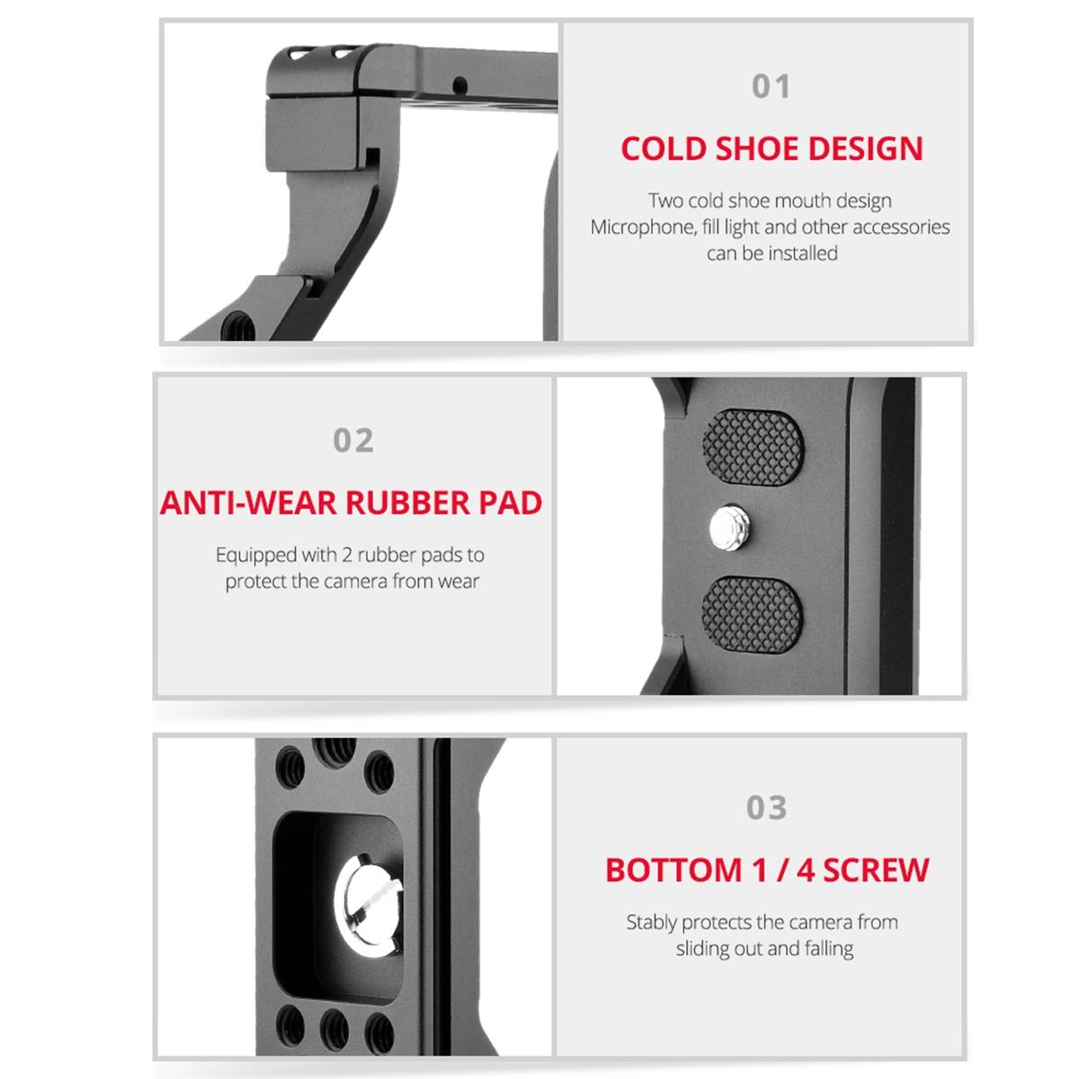 This video camera cage stabilizer is designed for Sony Alpha 7C and similar models, providing a durable and reliable support solution for filming. It features multiple attachment points and a secure design to enhance your filming experience.