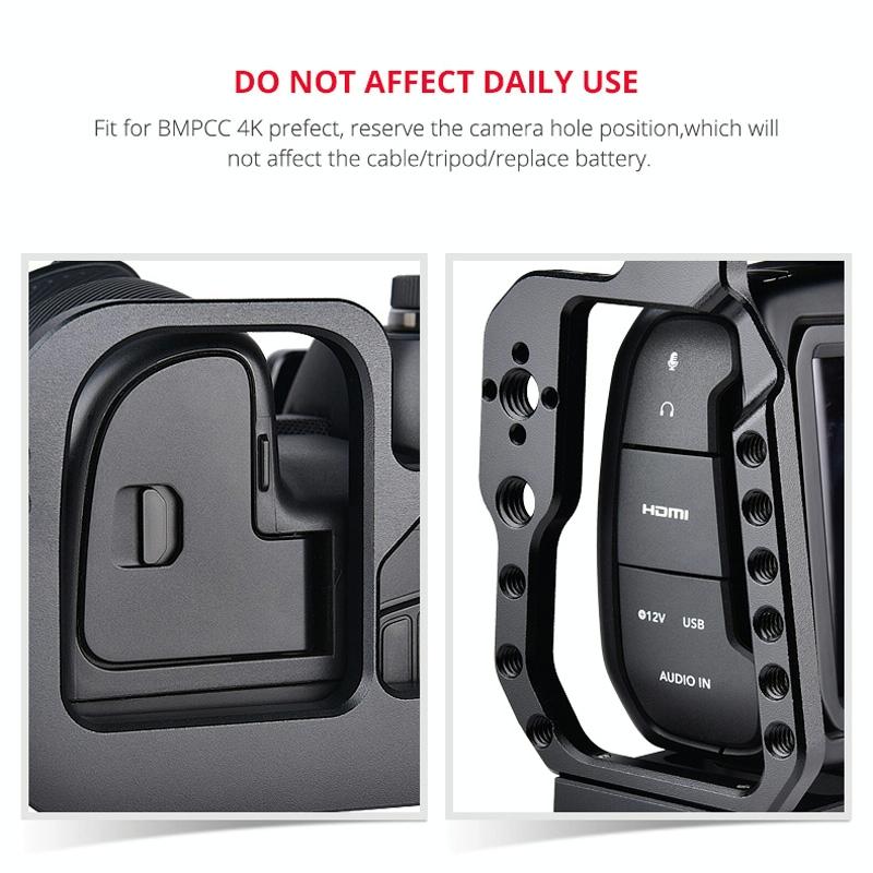 This video camera cage stabilizer is designed for use with the BMPCC 4K, providing a lightweight yet durable solution for stabilizing your camera setup. It features multiple threaded holes for attaching external accessories such as monitors, microphones, and lights, enhancing your filming capabilities.