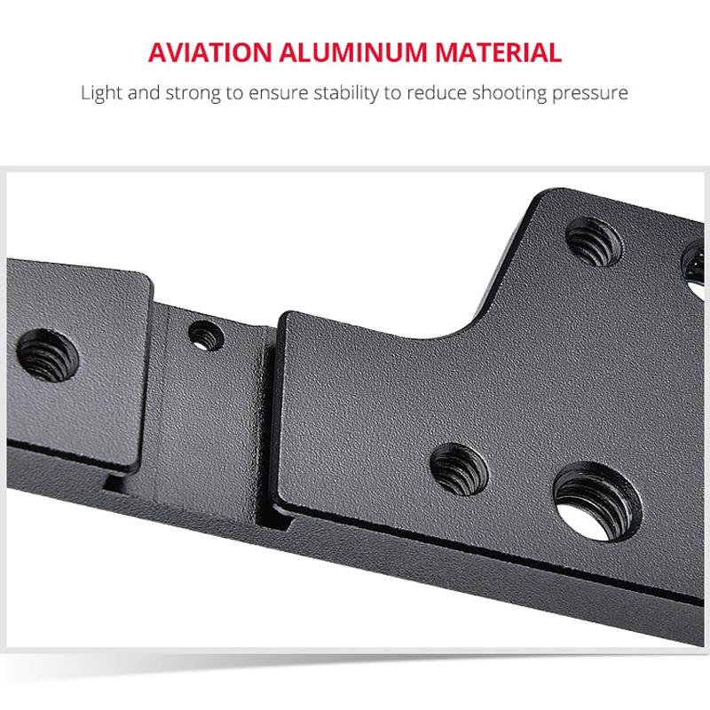 This video camera cage stabilizer is designed for use with BMPCC 4K cameras, providing a lightweight yet sturdy solution for handheld shooting. It features multiple threaded holes for attaching external accessories and is specifically tailored to fit the camera model with reserved camera hole positions. The handle is equipped with cold shoes and various screw interfaces to connect additional devices and adjust the center of gravity for optimal balance.