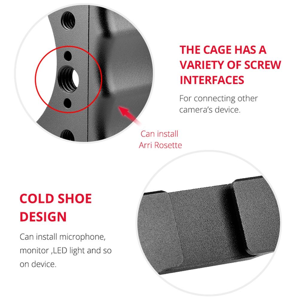 This video camera cage stabilizer with handle is designed for versatile and secure camera mounting. It features durable construction with surface anodizing and CNC machining for enhanced strength and longevity. The cage includes multiple external interfaces such as threaded holes, cold shoe ports, and Arri Rosette mounts to accommodate various external devices. Its ergonomic design allows for easy rotation of the camera screen and secure attachment to tripods or handheld setups.