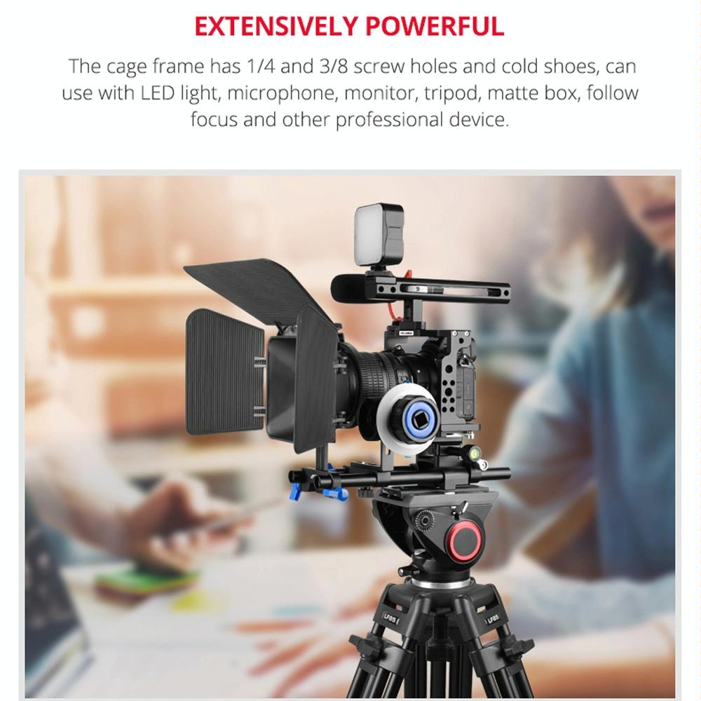 This product is a video camera cage stabilizer with a handle, designed to provide enhanced stability and versatility for camera setups. It features durable construction and multiple mounting options to accommodate various accessories, making it suitable for professional videographers and enthusiasts alike.