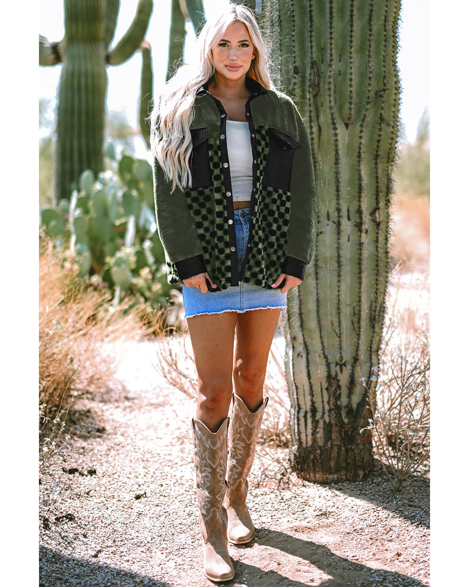 This stylish fleece jacket features a classic checkerboard pattern with a convenient flap pocket and snap button closures. Designed with a trendy fitted silhouette, it offers both comfort and fashion for everyday wear. The jacket is suitable for women and made from durable polyester material, ensuring warmth and longevity.