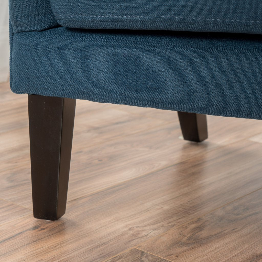 - Upholstered in smooth dark blue fabric