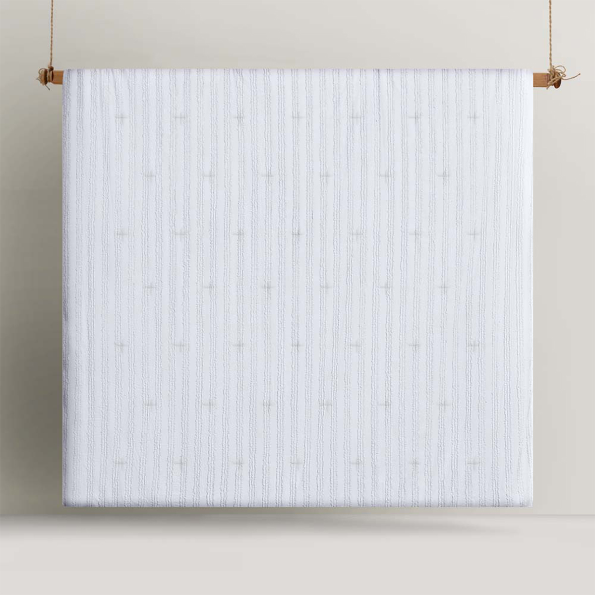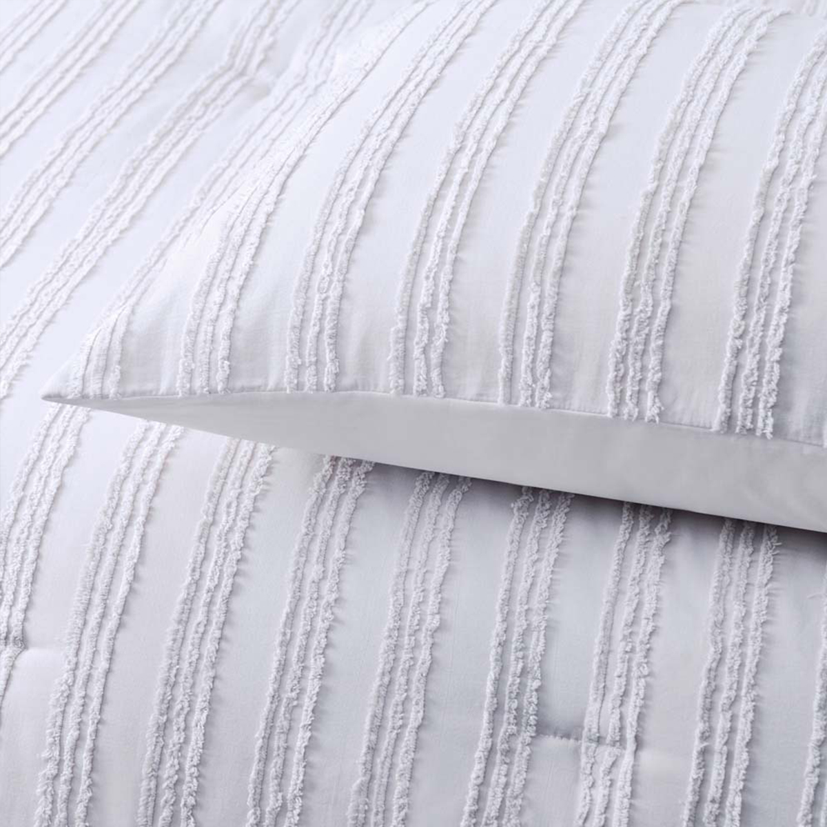 This comforter set features a minimalist design with chenille stripes running down the comforter and pillowcases, adding texture and style to your bedroom decor. Made from a cotton cover with a polyester filling, it offers comfort and durability for a good night’s sleep.