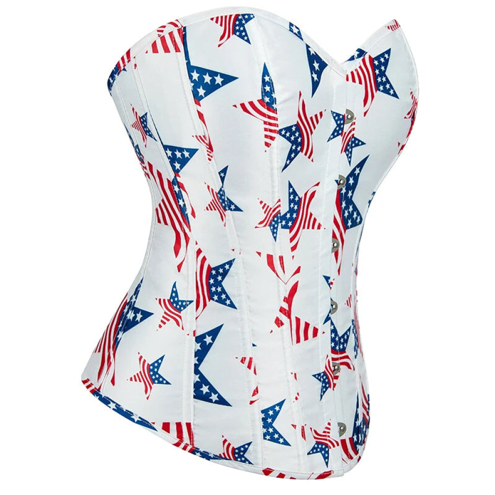 This vintage gothic fish bones lace-up satin overbust corset features a stylish design with a white USA flag pattern. Made from a blend of polyester and spandex, it offers a comfortable fit and supports the natural shape of the body. Suitable for everyday wear as well as parties, dates, and work occasions, it combines fashion with functionality.