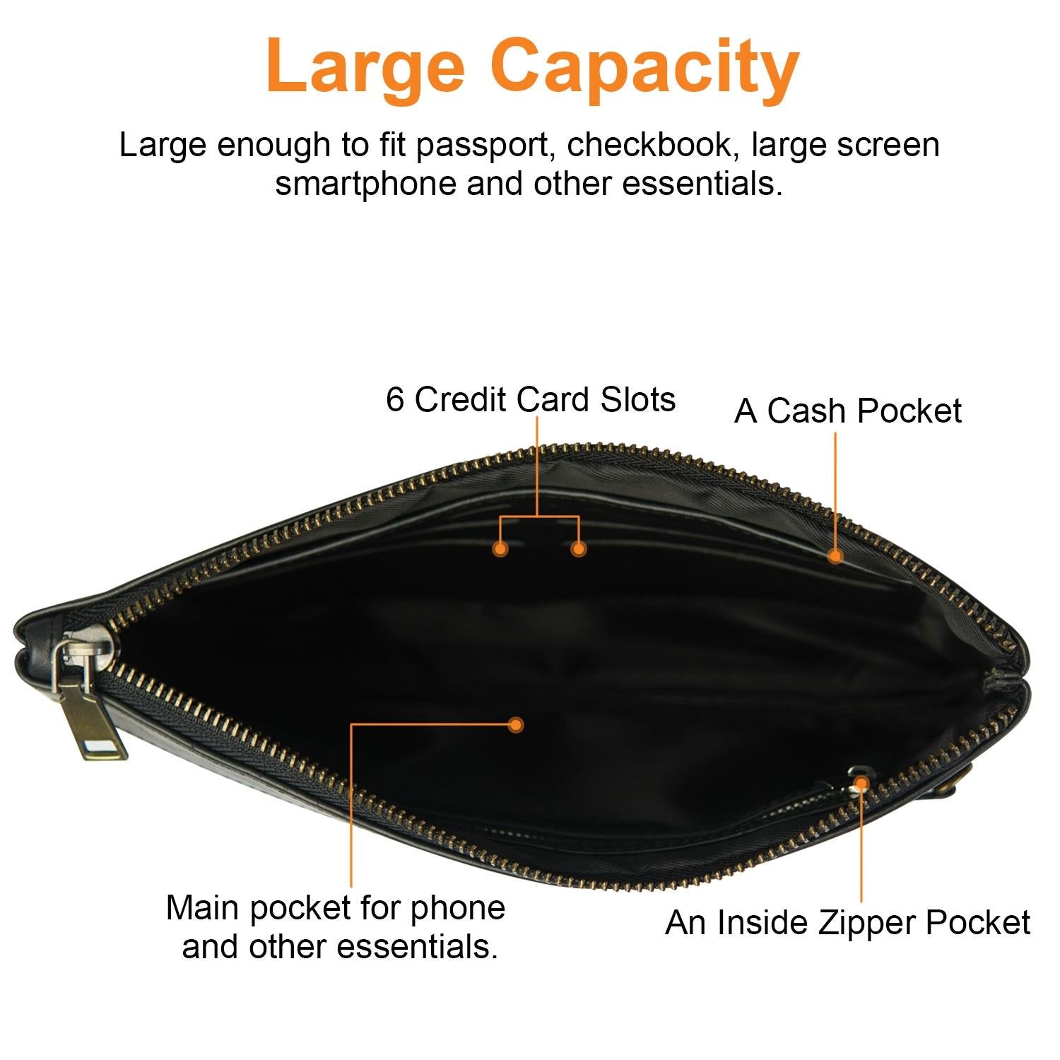 - Spacious enough to hold mobile phones, wallets, and tablets