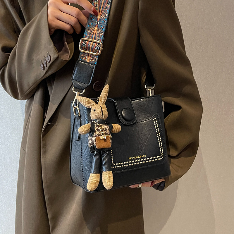 This vintage-style bucket bag is crafted from high-quality PU leather, featuring a textured finish that adds a retro charm. It combines classic design with modern details, making it suitable for various occasions. The bag includes a wide patterned shoulder strap for comfortable carrying and an optional bunny charm accessory for added personality. Its compact size makes it practical for daily essentials while maintaining a stylish appearance.