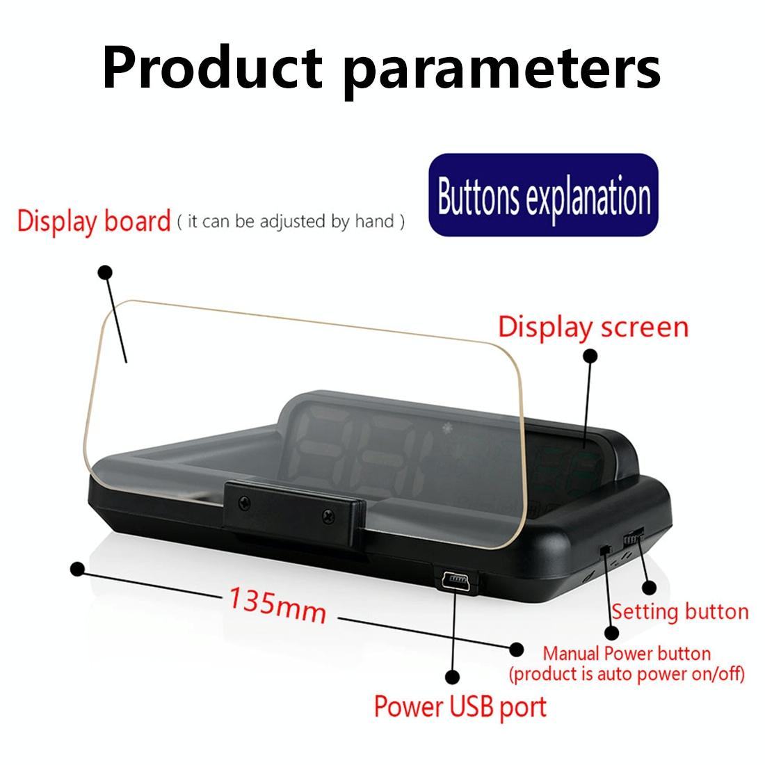 This virtual HD reflection board is designed for car GPS and HUD speed and distance display. It provides clear projection without ghosting or reflection film, ensuring visibility during daytime with adjustable projection angles. The device displays various car statistics including speed, voltage, mileage, compass, clock, altitude, trip time, satellite number, and over speed alarm. Made from high-temperature resistant ABS material, it features automatic brightness adjustment for optimal visibility and includes a fatigue driving alarm to remind drivers after extended periods of continuous driving.