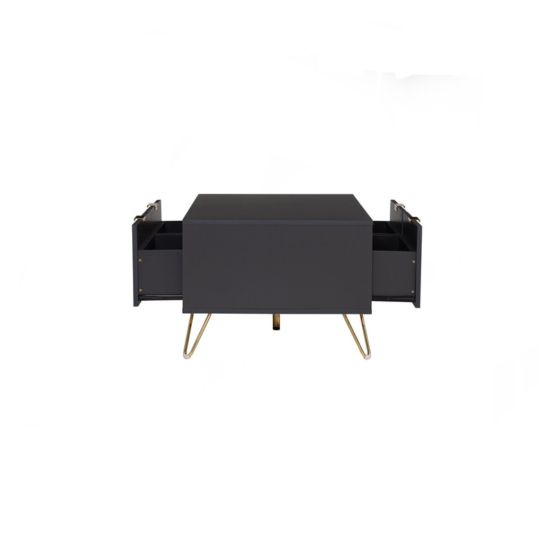 This coffee table features a sleek design with a black laminated top and gold-colored metal legs, making it a stylish addition to any living space. Its modern aesthetic combines functionality with contemporary style, suitable for various interior decors.