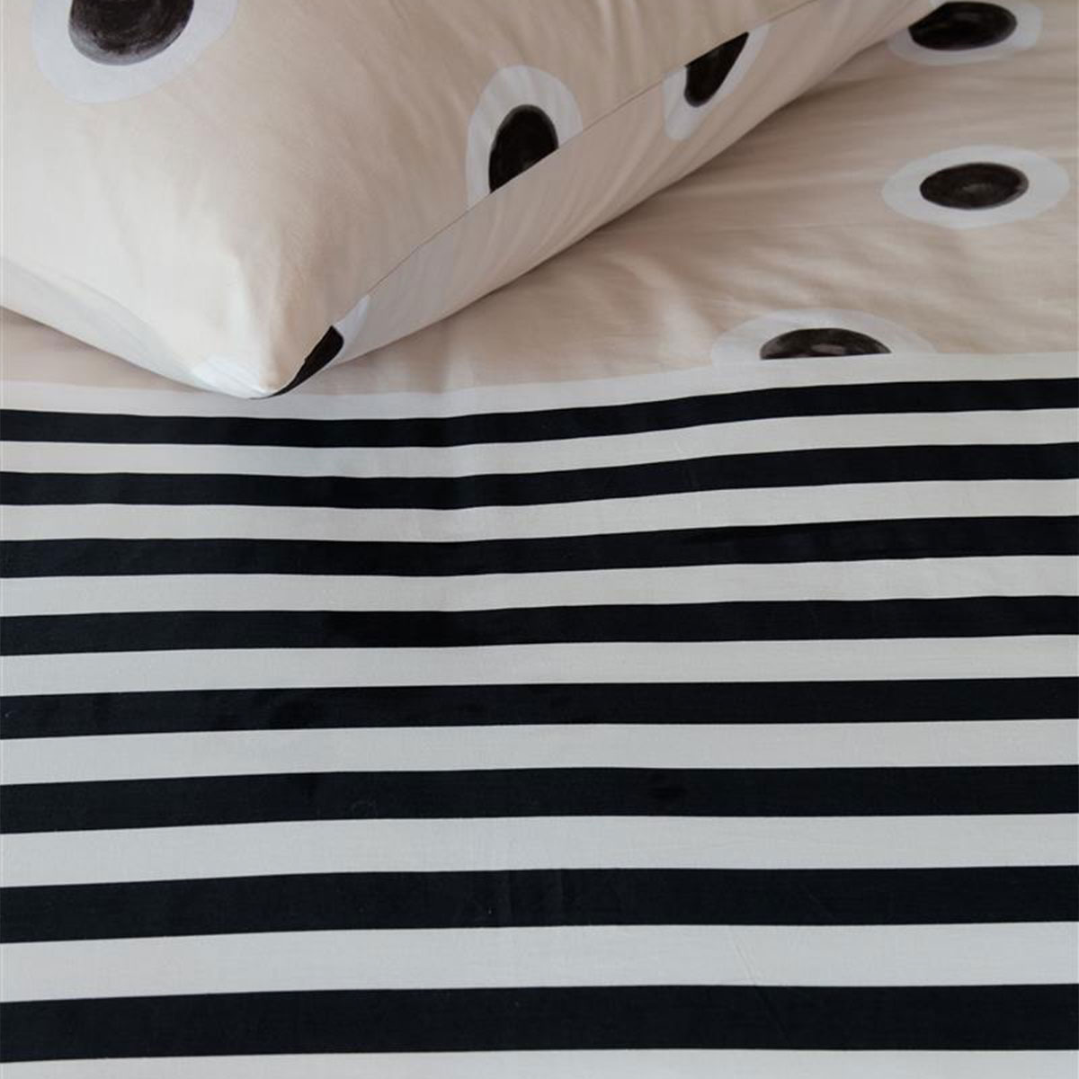 This quilt cover set features a stylish print of dots and stripes, combining hand-painted natural black and white dots on a cream background with horizontal black and white stripes on the reverse side. The design is identical on both sides, offering versatile styling options for your bedroom.