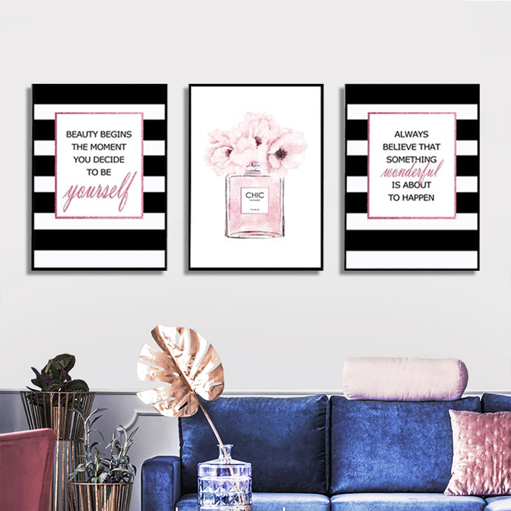 This wall art set features three pieces of fashion-inspired prints, each measuring 70cm by 100cm, framed in black. The artwork is designed to enhance home decor with a modern and stylish aesthetic, making it suitable for various interior styles and occasions.