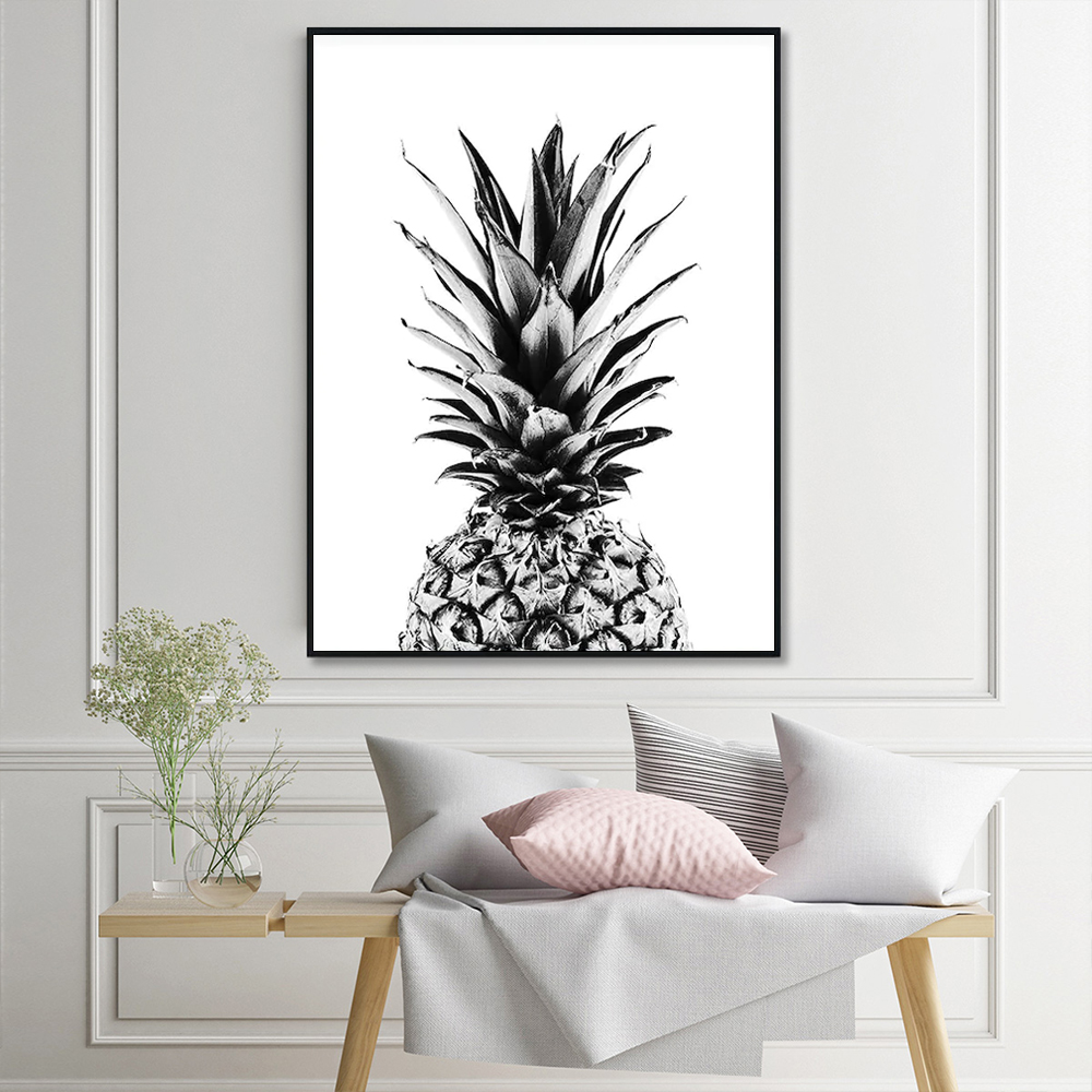 This wall art features a pineapple design with dimensions of 70cm by 100cm, framed in black. It is printed on high-quality canvas with vibrant, long-lasting pigment inks, making it suitable for home decor or as a gift for various occasions. The artwork is produced and shipped locally, ensuring quality and prompt delivery.