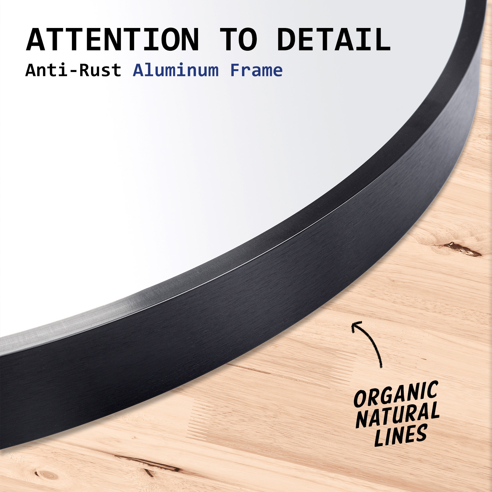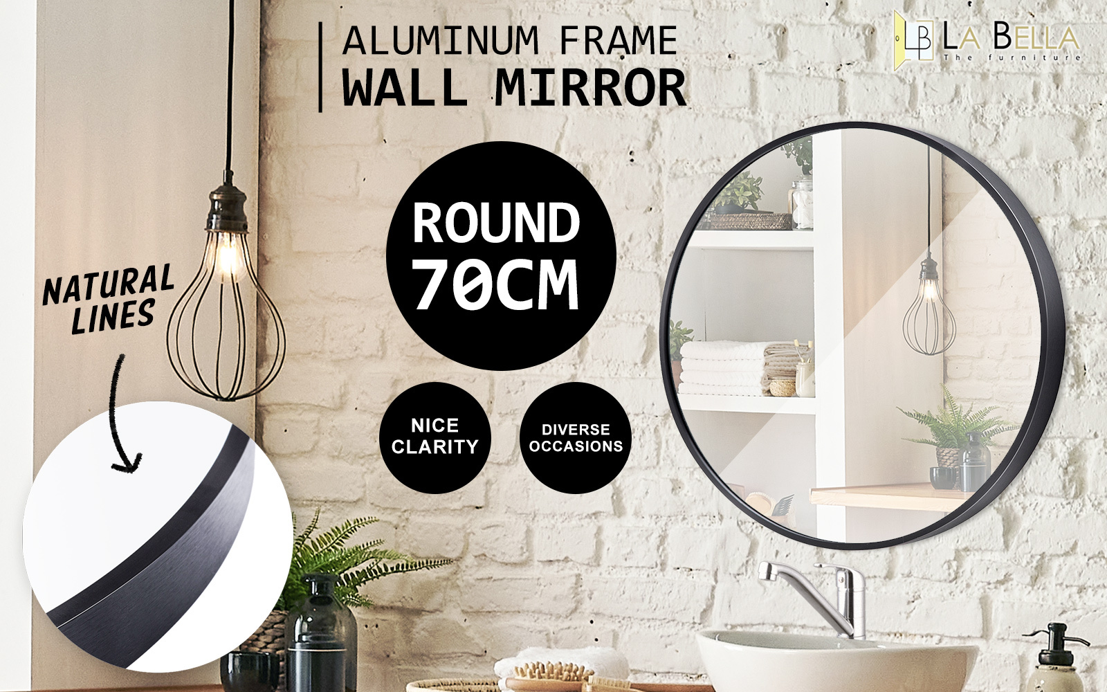 This round wall mirror features a sleek aluminum frame and a large reflective surface, making it a stylish and functional addition to various spaces. Its modern design enhances the decor while creating an illusion of a larger, brighter room. Suitable for use in bathrooms, bedrooms, living rooms, entryways, or commercial areas, it combines practicality with aesthetic appeal.