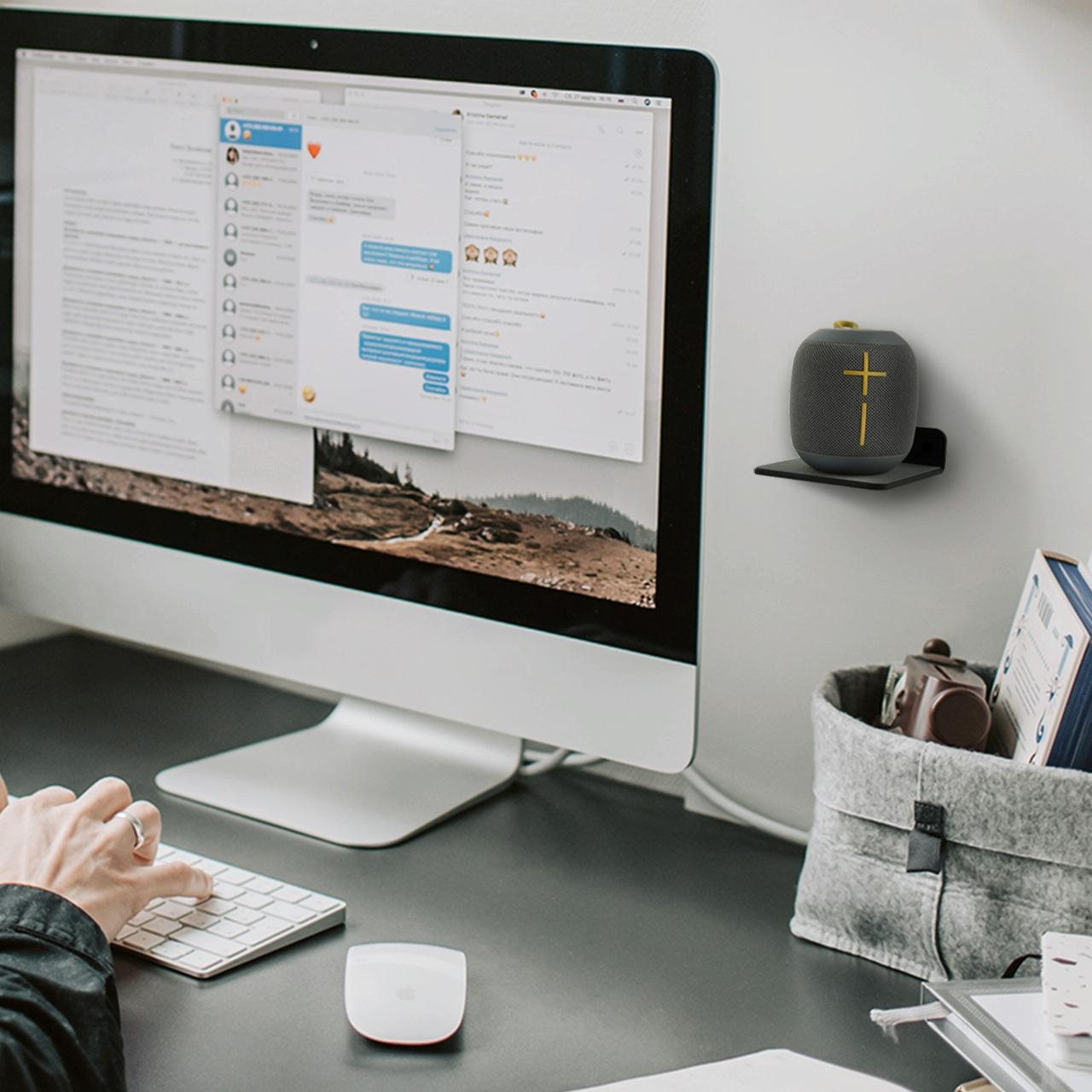 This wall-mounted Bluetooth speaker bracket is designed for versatile use, providing a convenient solution for holding speakers, phones, and other devices. It features a durable acrylic construction that is lightweight and resistant to rust, making it suitable for various environments. The bracket can support devices weighing up to 800 grams, ensuring stability and security.