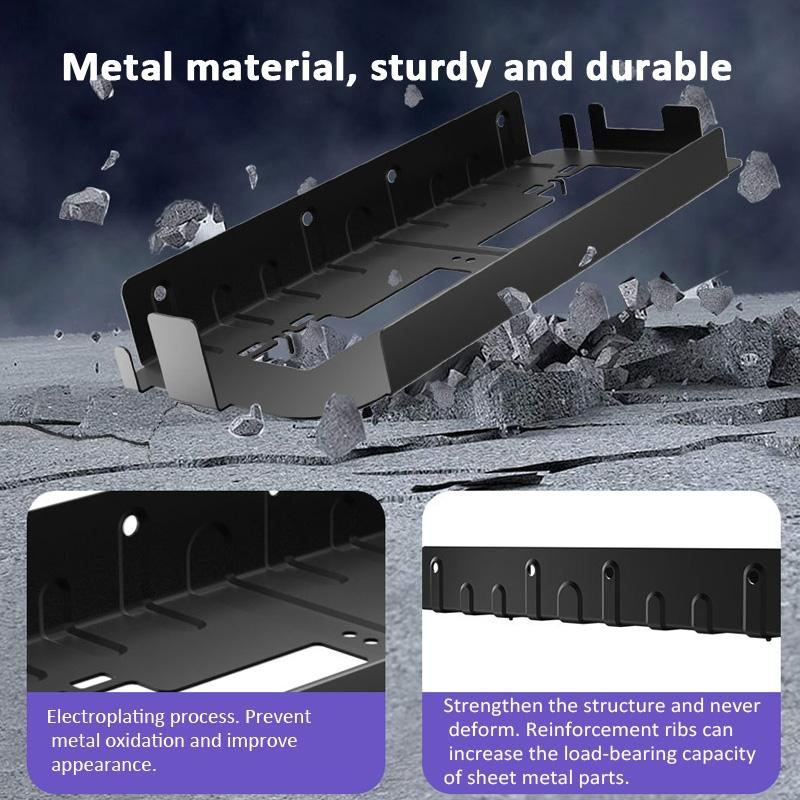 This wall-mounted bracket is designed to organize and store your PS5 console, controllers, VR glasses, headphones, and other accessories. It features a sturdy metal construction with an electroplating finish to prevent oxidation and enhance appearance. The design includes heat dissipation holes to prevent overheating and screw fixing points for added stability. Equipped with horizontal hooks covered with soft rubber pads, it ensures safe and stable placement of your devices.