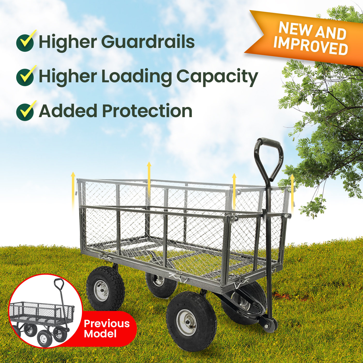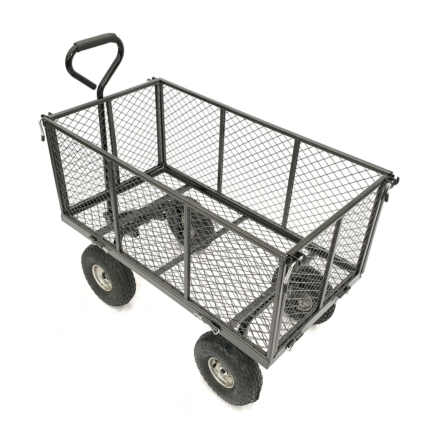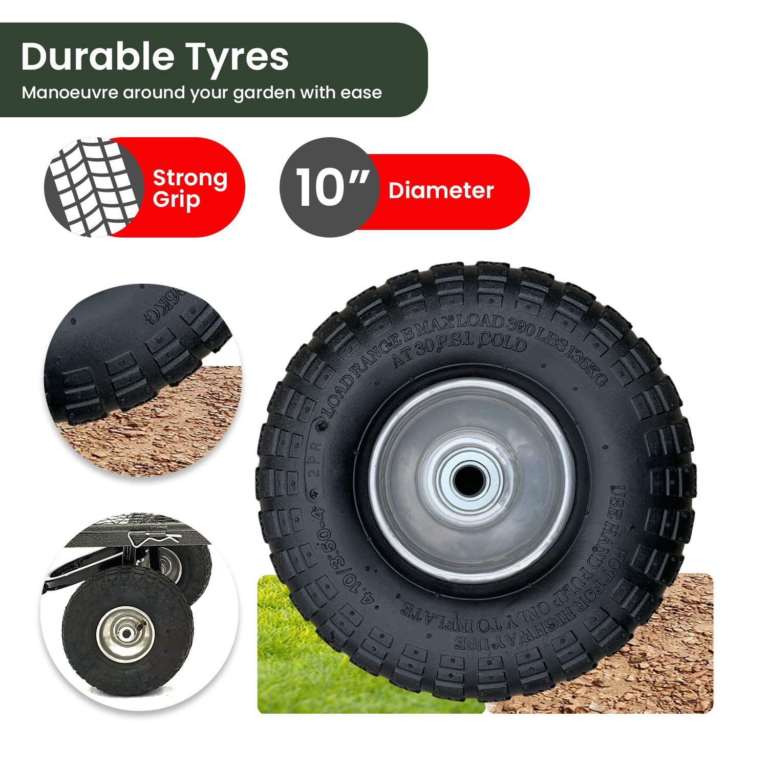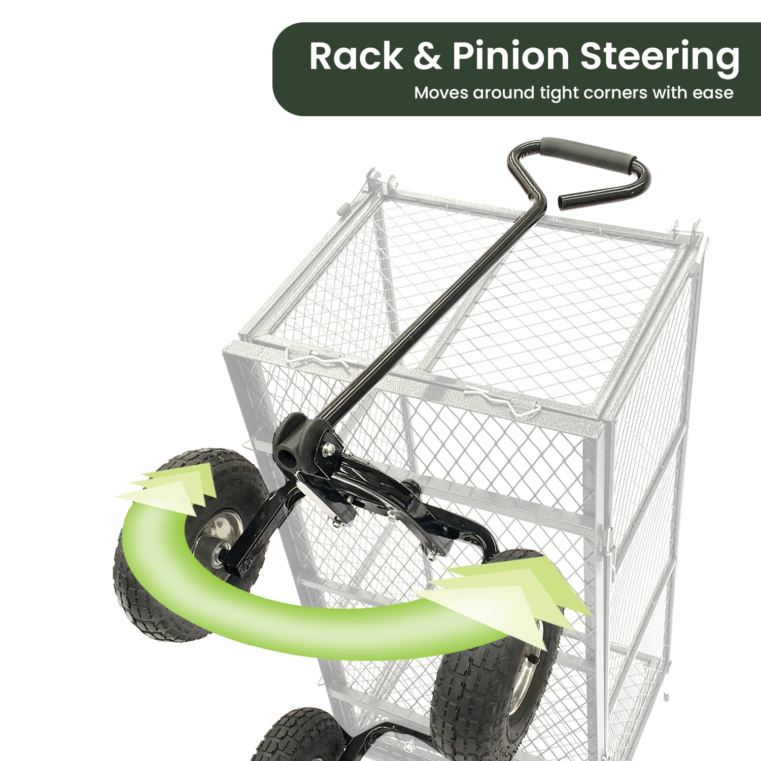 This heavy-duty garden trolley cart is designed to make landscaping and yard work more efficient. It features a large capacity with deep sides and versatile functionality, suitable for transporting plants, soil, rocks, mulch, decorations, and other large items around your home or garden. The cart is built with durable steel mesh sides that can be folded down or removed to convert it into a flatbed trolley, allowing for wider loads such as tiles, slabs, and pallets. Equipped with rack and pinion steering and a padded handle, it offers easy maneuverability and comfort during use.