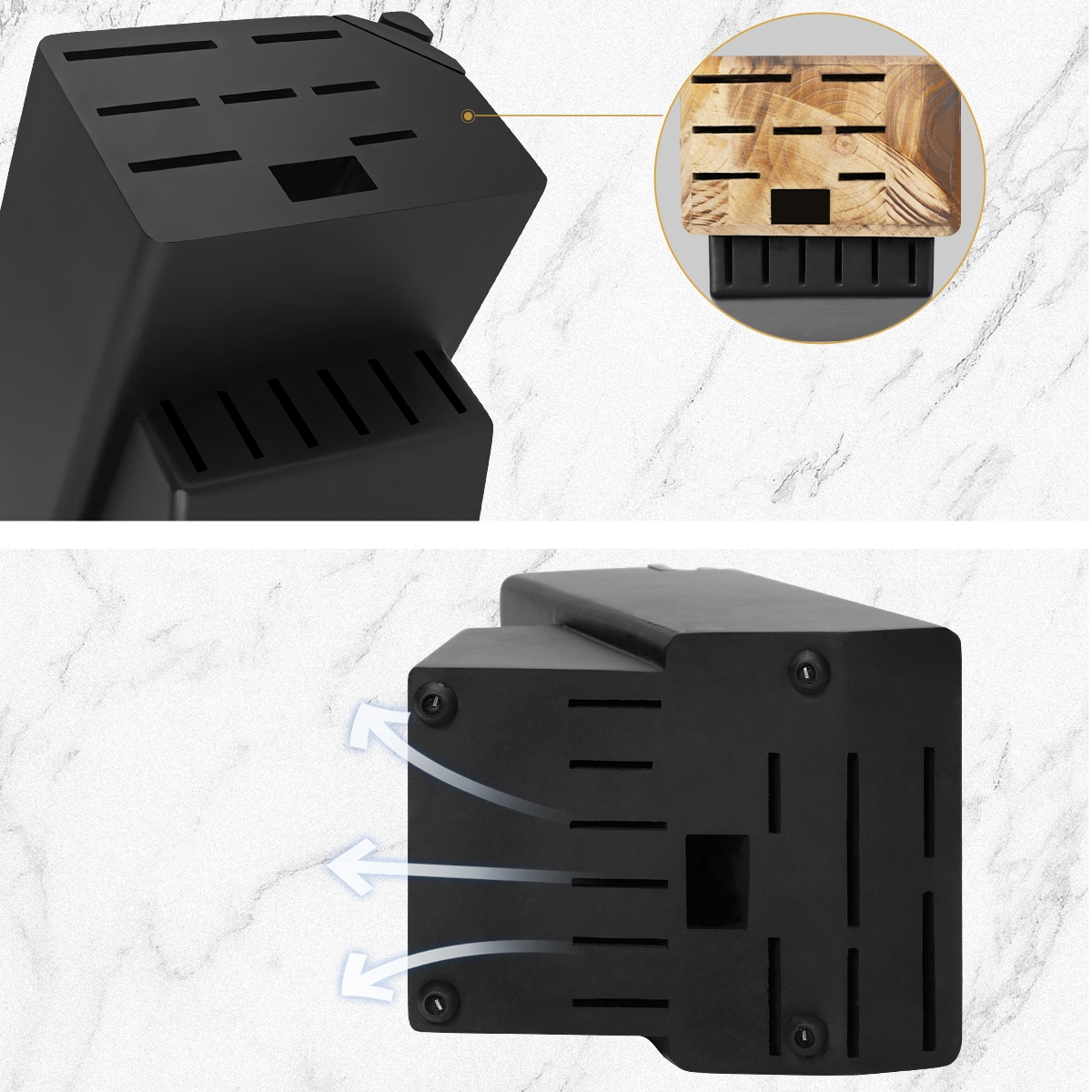 • Knives are easy to store in the ventilated wooden block, which helps prevent rust and keeps knives organized.