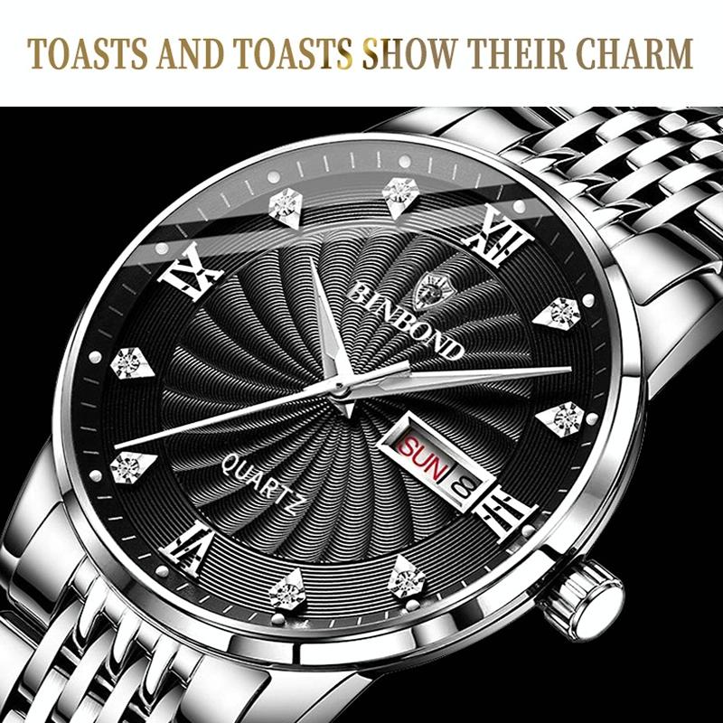 This waterproof business men’s quartz watch features a luminous dial and a butterfly buckle for secure and comfortable wear. It is designed to combine functionality with a sleek appearance, suitable for professional settings and everyday use.