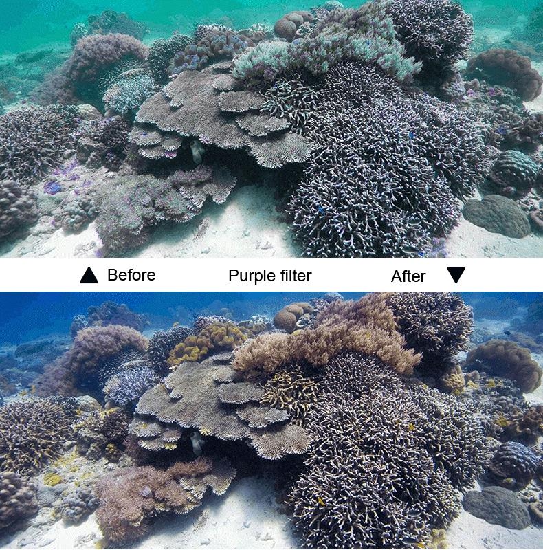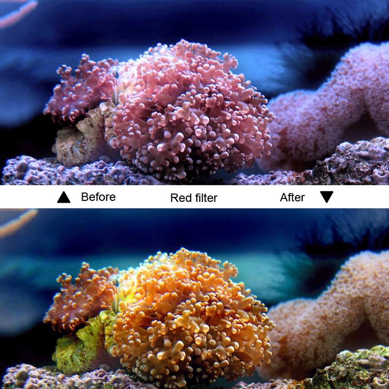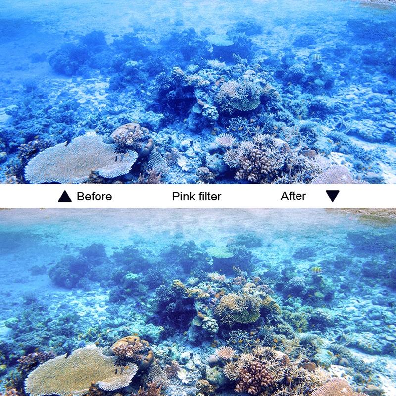 • Comes with three color filters: purple for freshwater color correction, red for deep water color correction, and pink for shallow water light correction