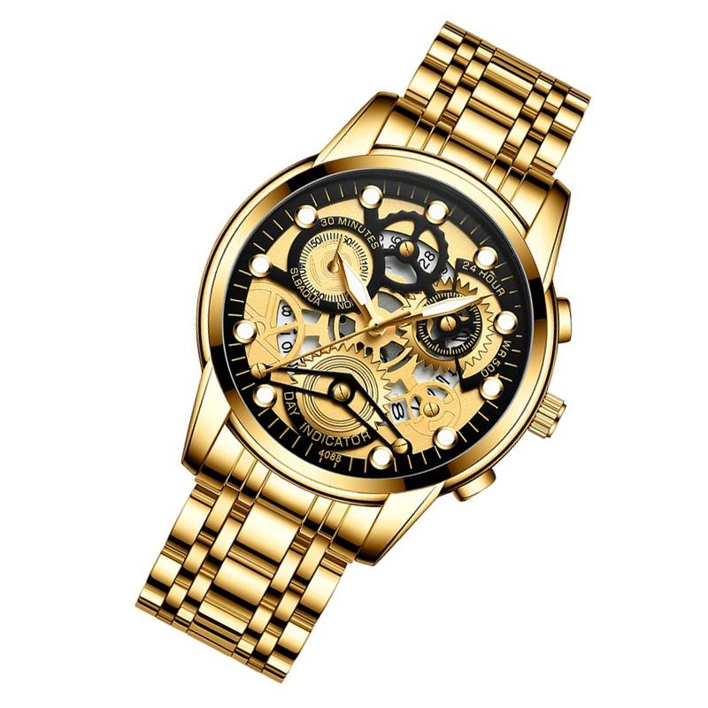 This waterproof luminous men’s quartz watch features a hollow design with a full gold or black surface, offering a sleek and modern appearance. It combines classic style with functional features, making it suitable for various occasions.