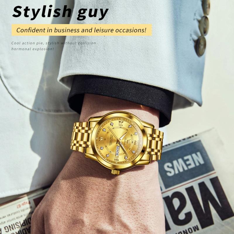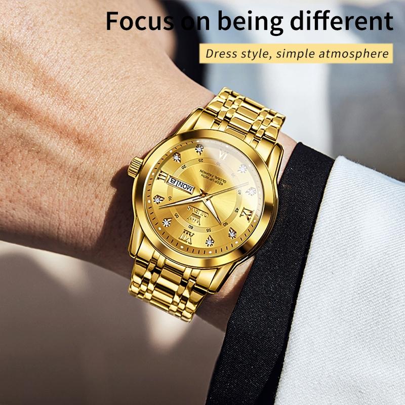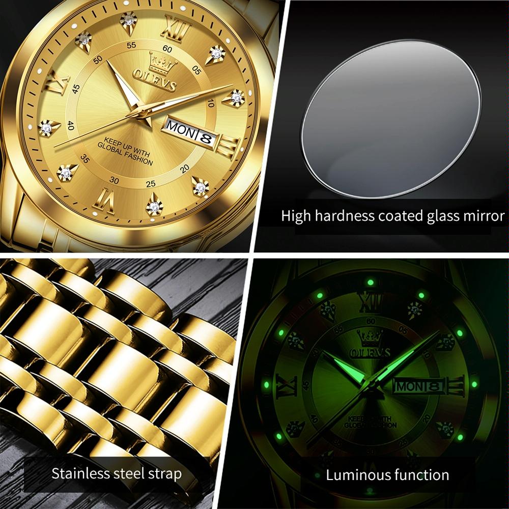 This waterproof luminous quartz watch combines a business style design with functional features suitable for daily wear. It offers accurate timekeeping, a durable stainless steel bracelet, and an electroplated case for a sleek appearance. The watch is designed with a luxurious three-dimensional diamond-set dial, dual calendar display, and high-definition luminous coating for easy reading at night. Its deeply waterproof sealing ring enhances anti-fog performance, making it a reliable choice for various conditions.