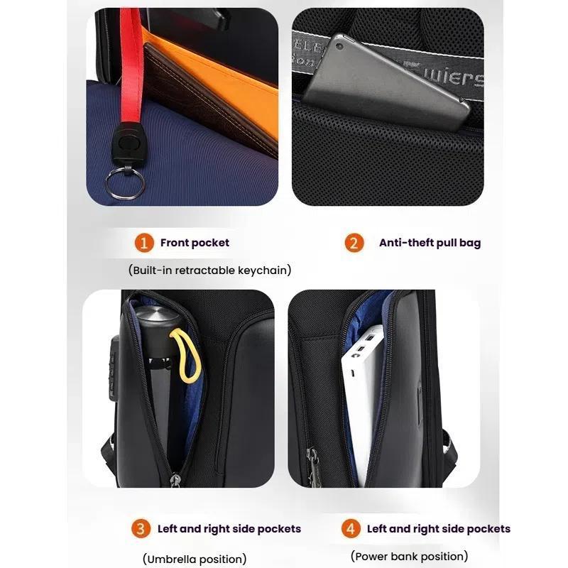 This waterproof men’s business backpack combines functionality with a sleek design, making it suitable for professional and everyday use. It offers multiple compartments and pockets for organized storage, a dedicated laptop compartment with shock-absorbing foam for full protection, and convenient external ports for quick phone charging. The backpack is crafted from durable high-density Oxford fabric with leather accents, ensuring longevity and a sophisticated appearance.