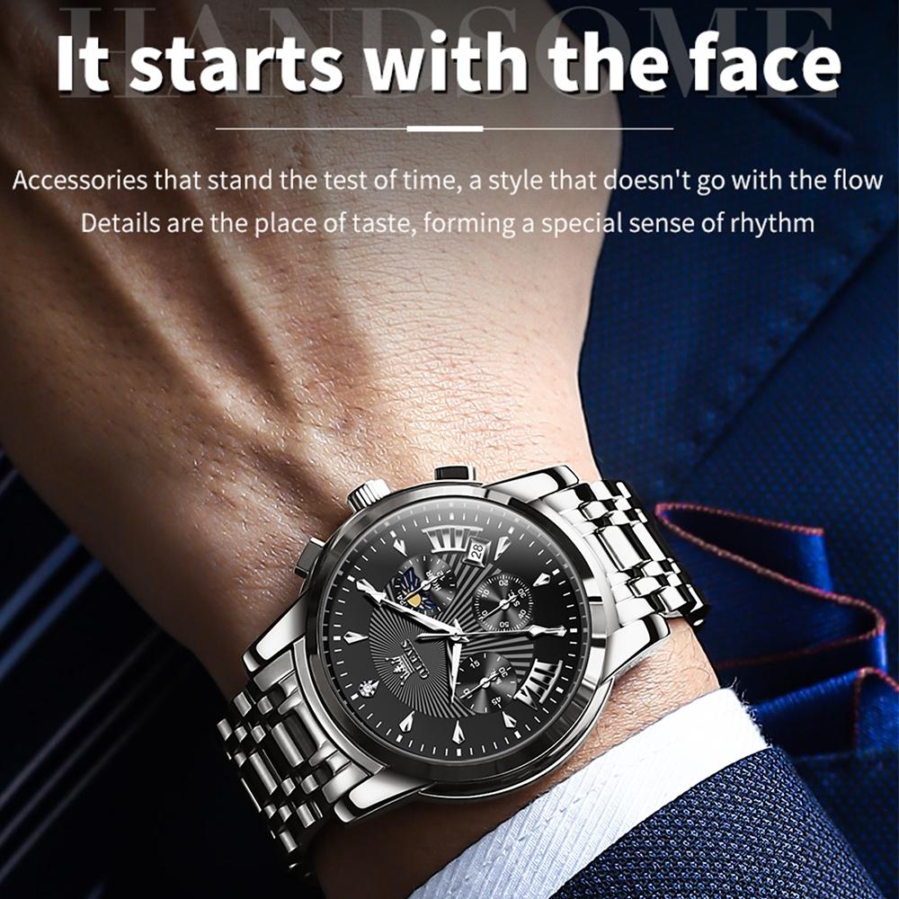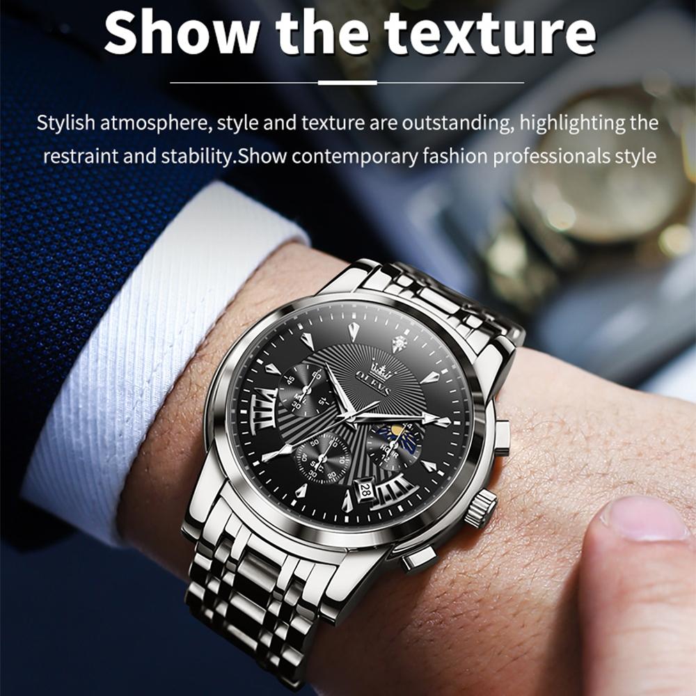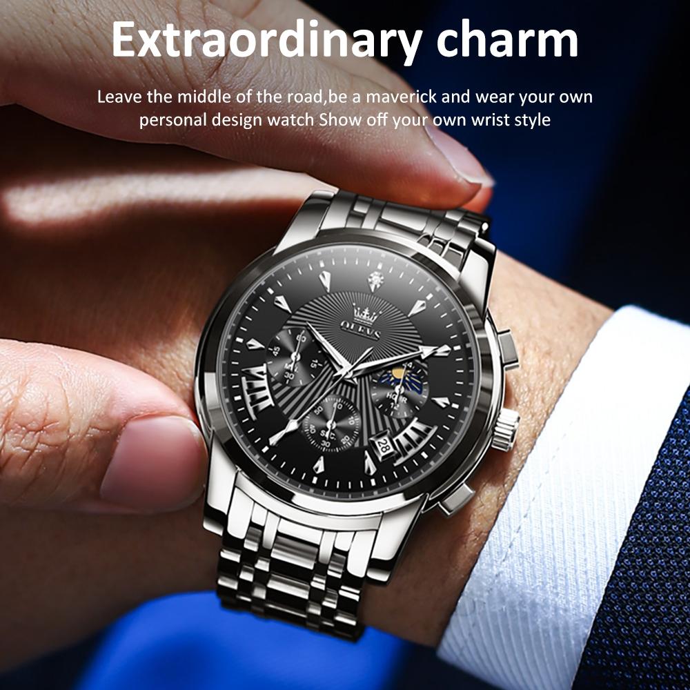 This multifunctional men’s quartz watch combines a business-oriented design with practical features. It offers accurate timekeeping, durability, and a stylish appearance suitable for daily wear and formal occasions.
