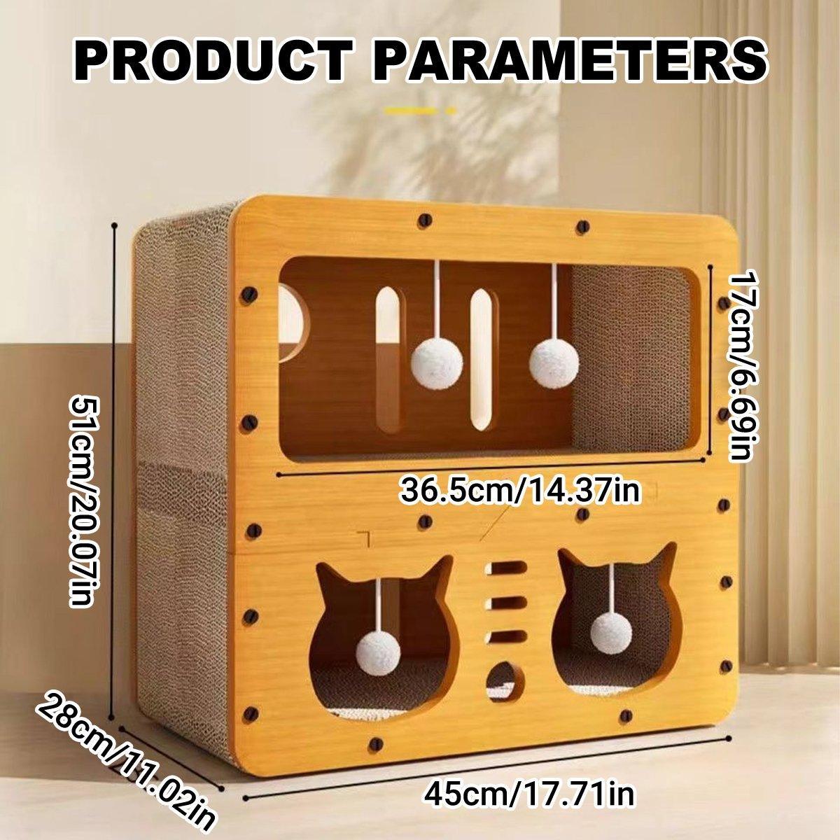 This wear-resistant cat scratcher board house is designed to provide cats with a dedicated space to scratch, climb, and relax throughout all seasons. It combines a comfortable resting area with a durable scratch-resistant tower, promoting healthy scratching and play while protecting your furniture. Made from high-density corrugated cardboard and reinforced with a sturdy wooden frame, it offers long-lasting durability. Its stylish design complements various home decors, making it a practical addition to your living space.