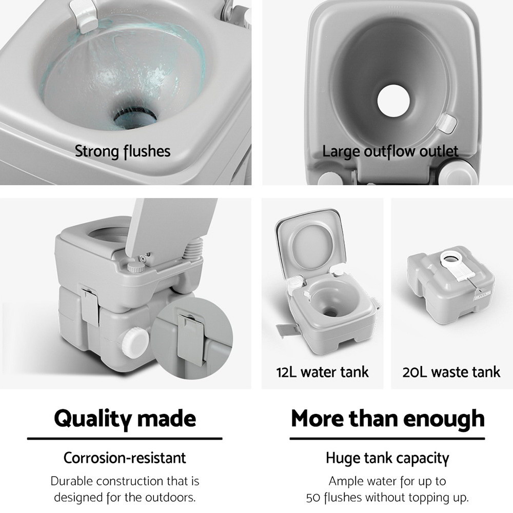 This portable camping toilet offers a reliable and convenient solution for outdoor sanitation needs. It features a durable construction with a generous water reserve, making it suitable for camping, boating, and other outdoor activities. The design ensures ease of use, cleanliness, and portability without the need for external water or power sources.