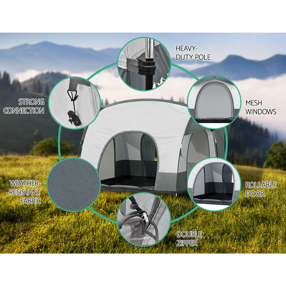 This camping tent is designed for outdoor use and can be connected to a vehicle to expand your living space. It features water-resistant and UV-protective fabric, sturdy poles for stability, and convenient openings with double-sided zippers. The tent includes rollable windows and doors for ventilation and built-in storage pockets for camping essentials.