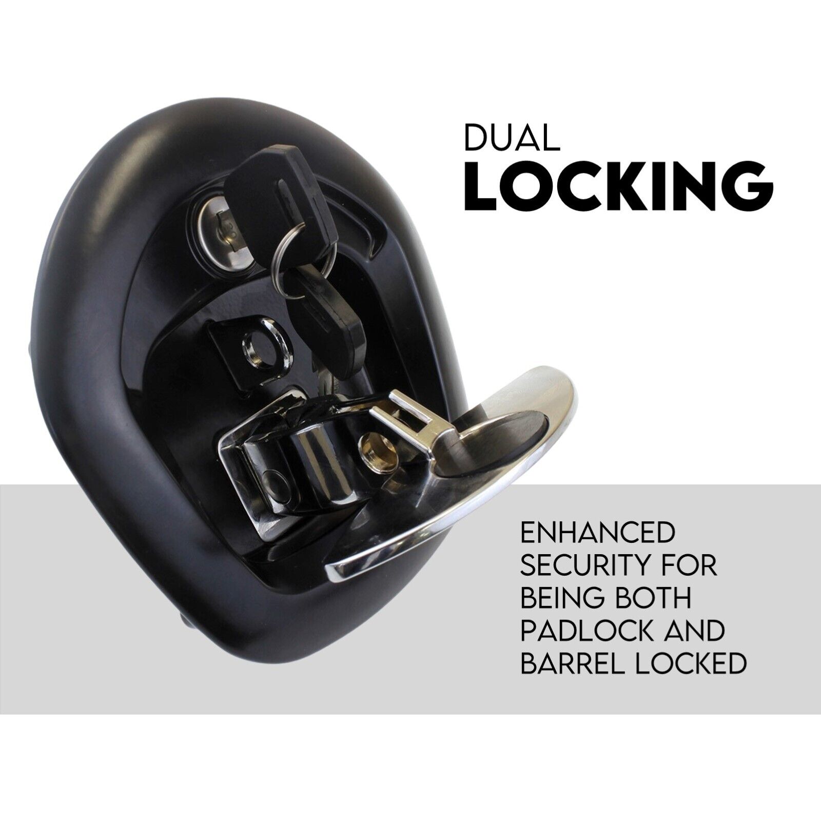 This whale tail lock is designed to provide enhanced security for toolboxes, trailers, and other storage compartments. It features a heavy-duty construction with a black powder-coated finish, ensuring durability and a sleek appearance. The lock is versatile, suitable for various applications, and easy to operate with an ergonomic handle and key locking mechanism.
