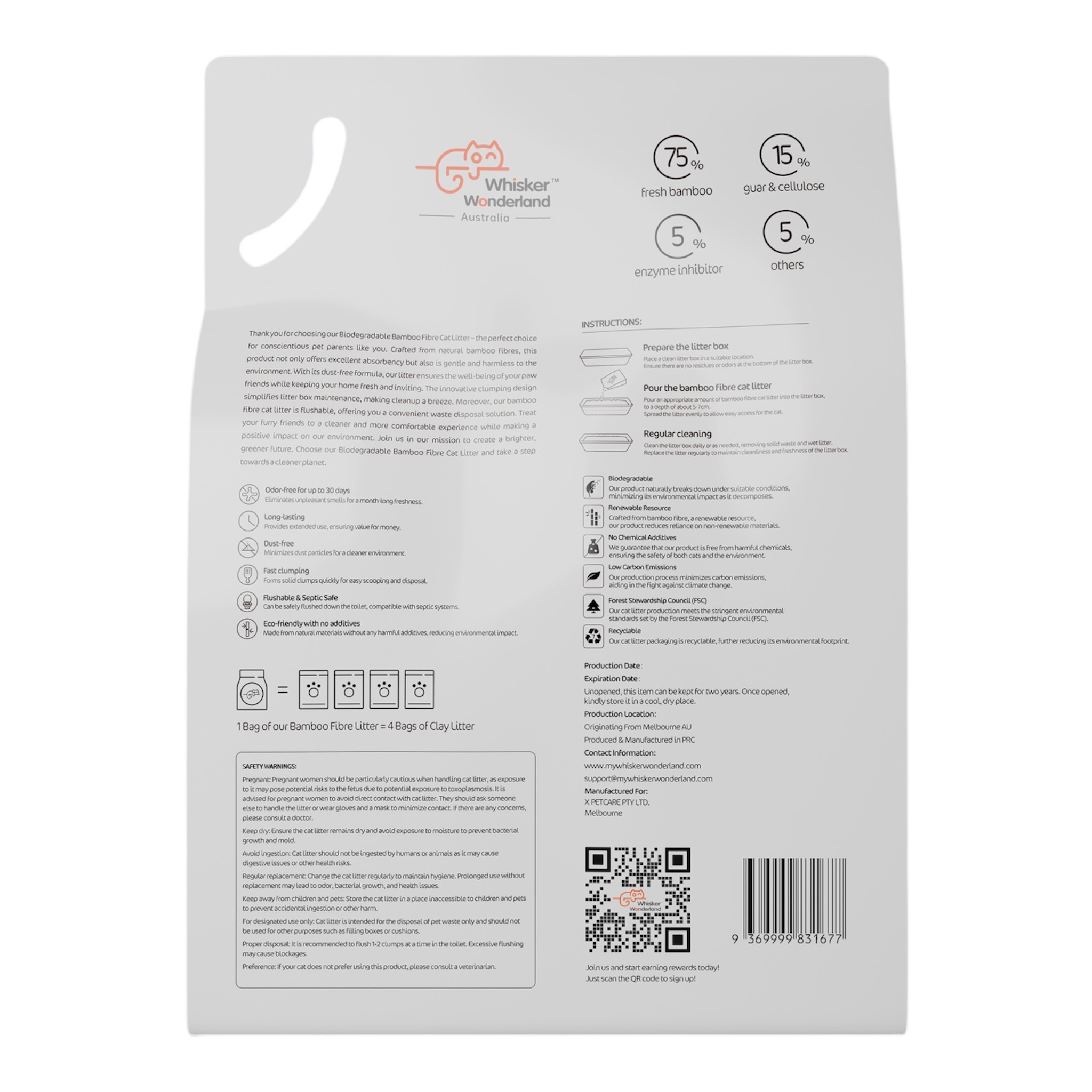 This biodegradable bamboo fibre cat litter offers a sustainable and effective solution for maintaining a clean and fresh litter box environment. It features excellent odour control, rapid clumping, and is flushable for easy disposal. Made from natural bamboo fibre, it is safe for pets and environmentally friendly, providing a comfortable and hygienic experience for your feline companion.