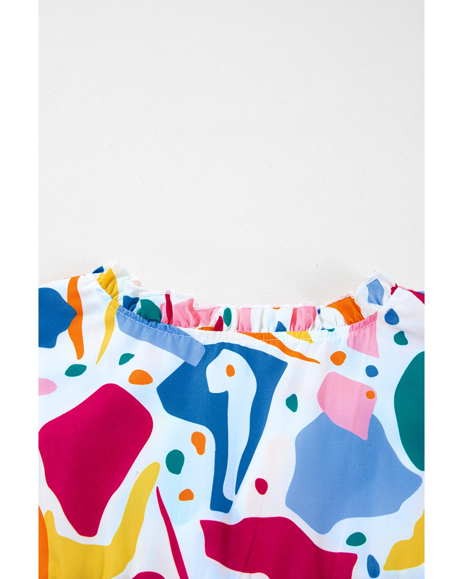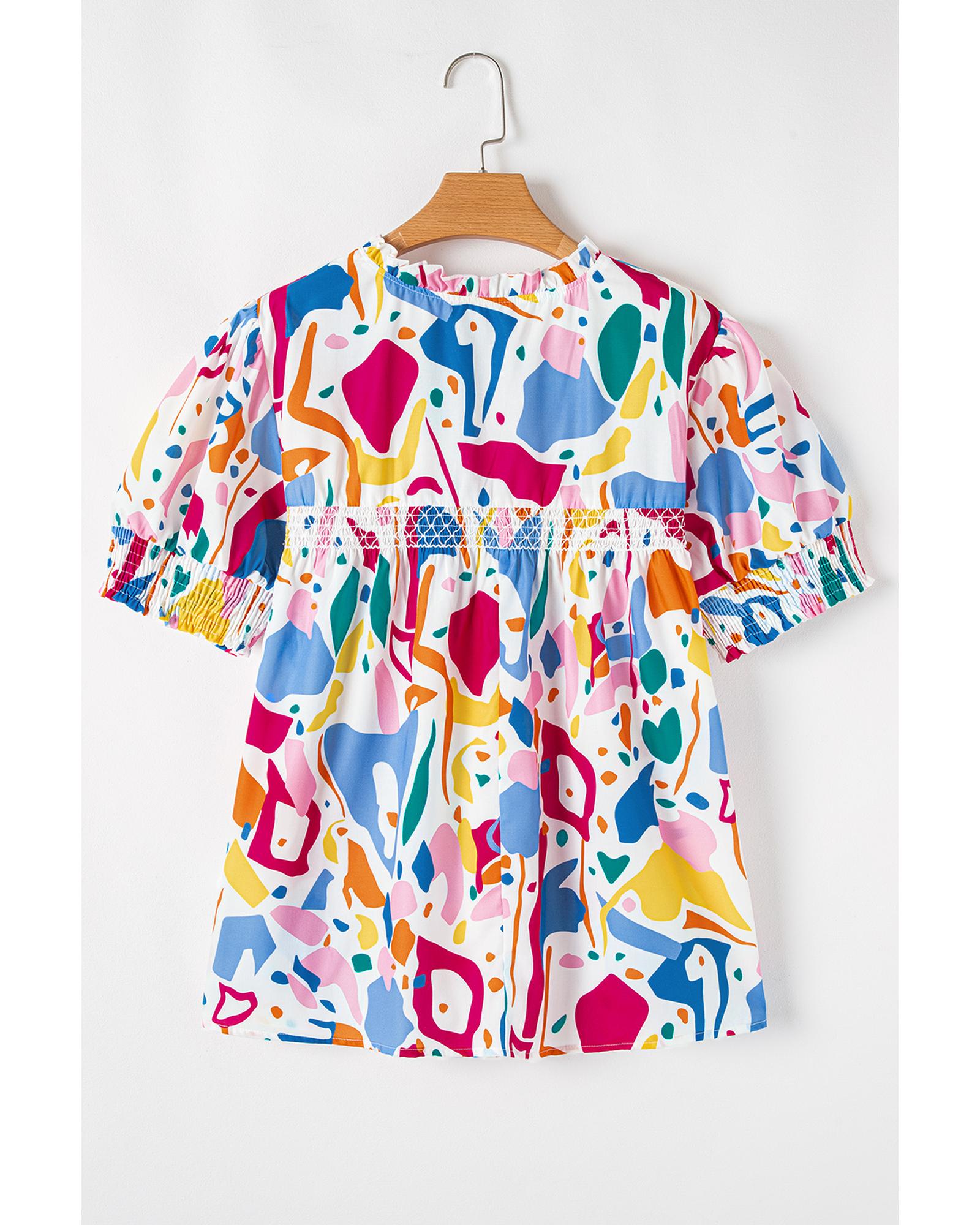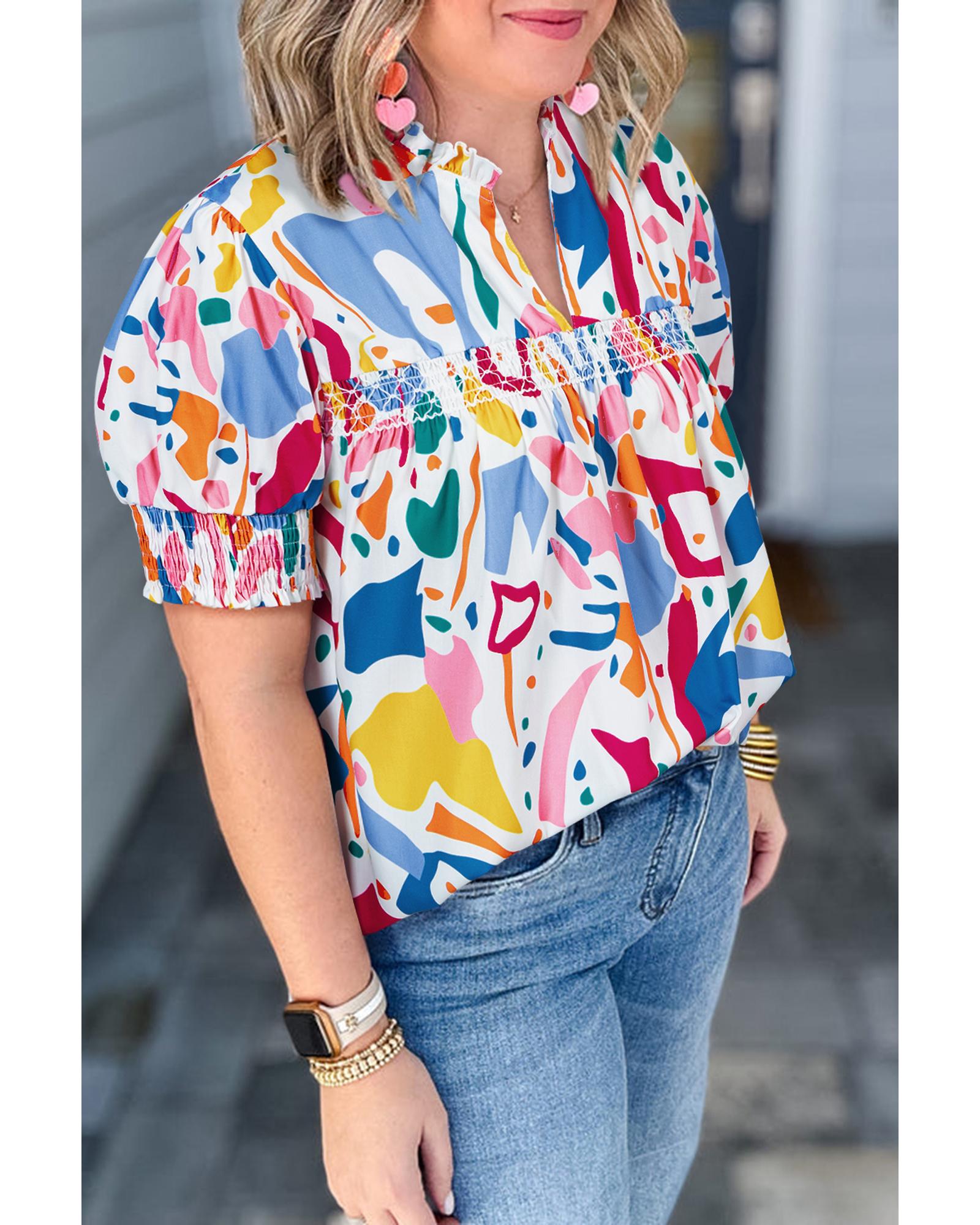 This stylish blouse features a white abstract print combined with elegant puff sleeves and shirred cuffs, creating a fashionable and comfortable fit. Designed specifically for plus size figures, it offers a chic silhouette suitable for various occasions.
