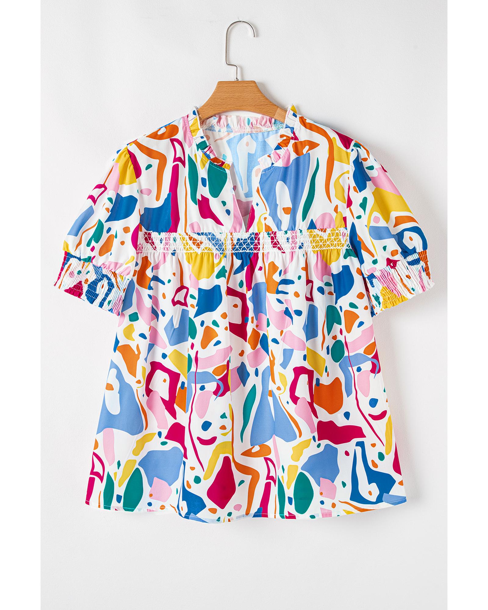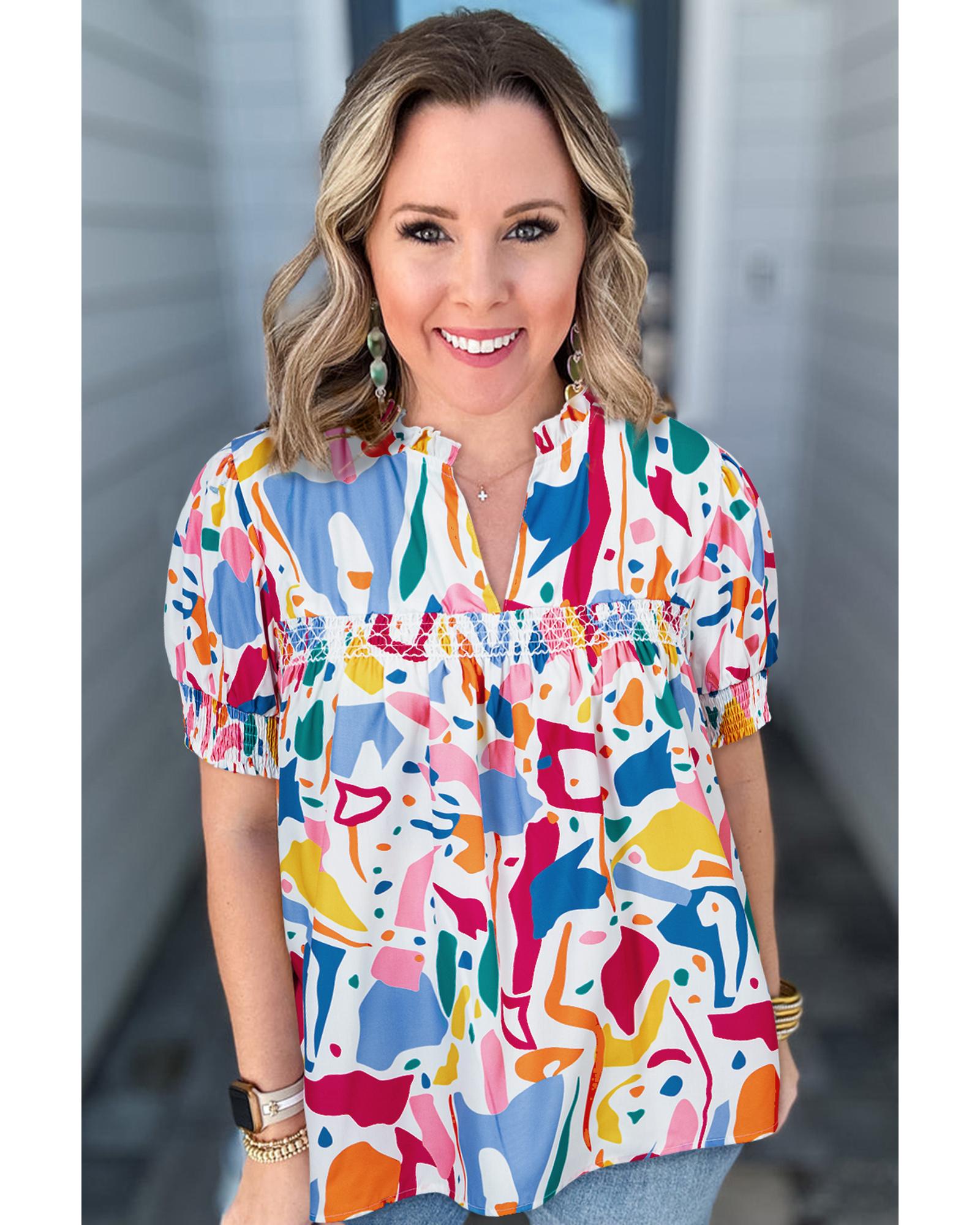 This stylish blouse features an abstract print design that adds a modern and trendy touch to your wardrobe. The shirred cuffs provide a comfortable and adjustable fit, while the puff sleeves create a feminine and fashionable silhouette. Designed specifically for plus size figures, this blouse combines style and comfort effortlessly.