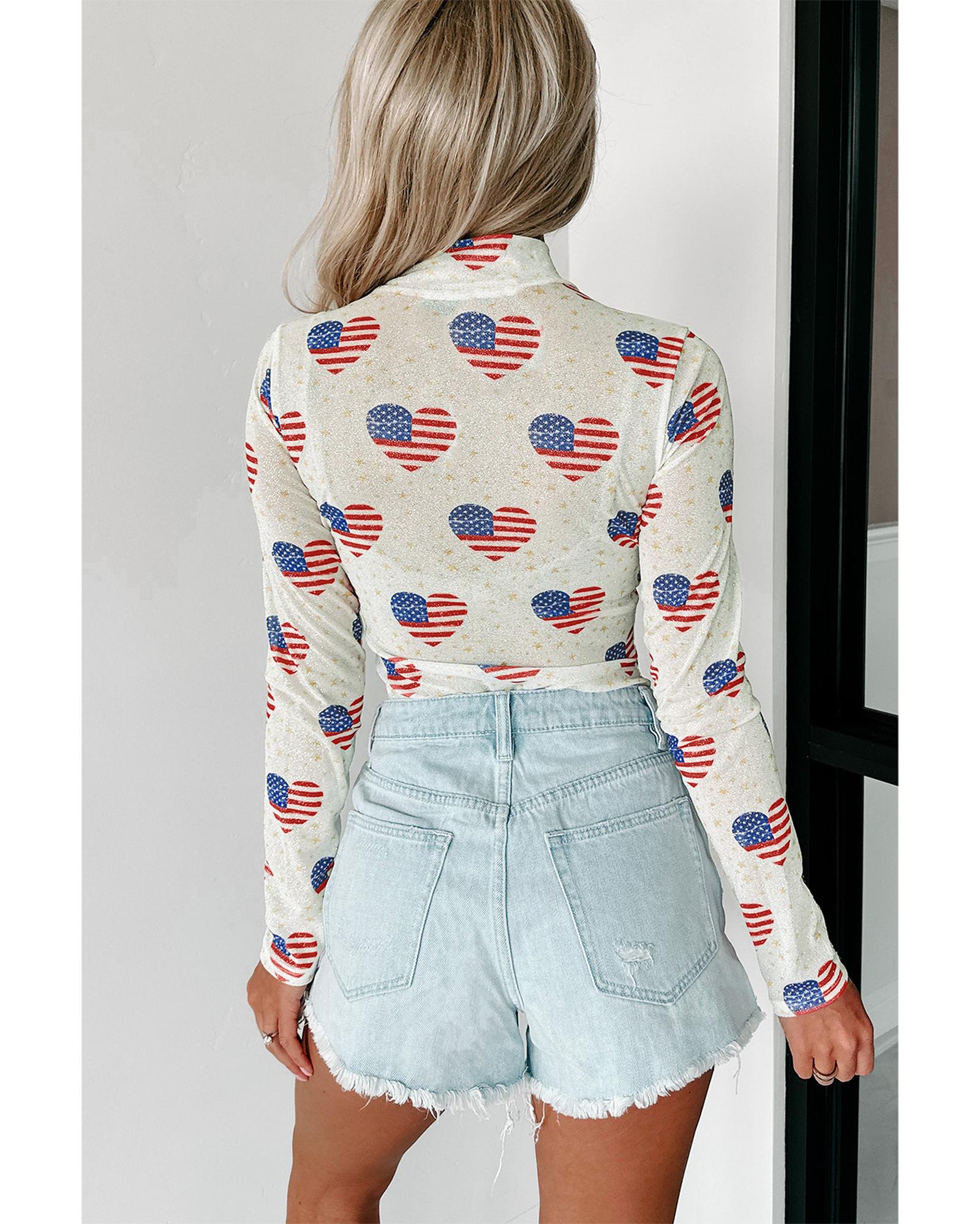 White Americana Glitter Mesh Long Sleeve Bodysuit – S