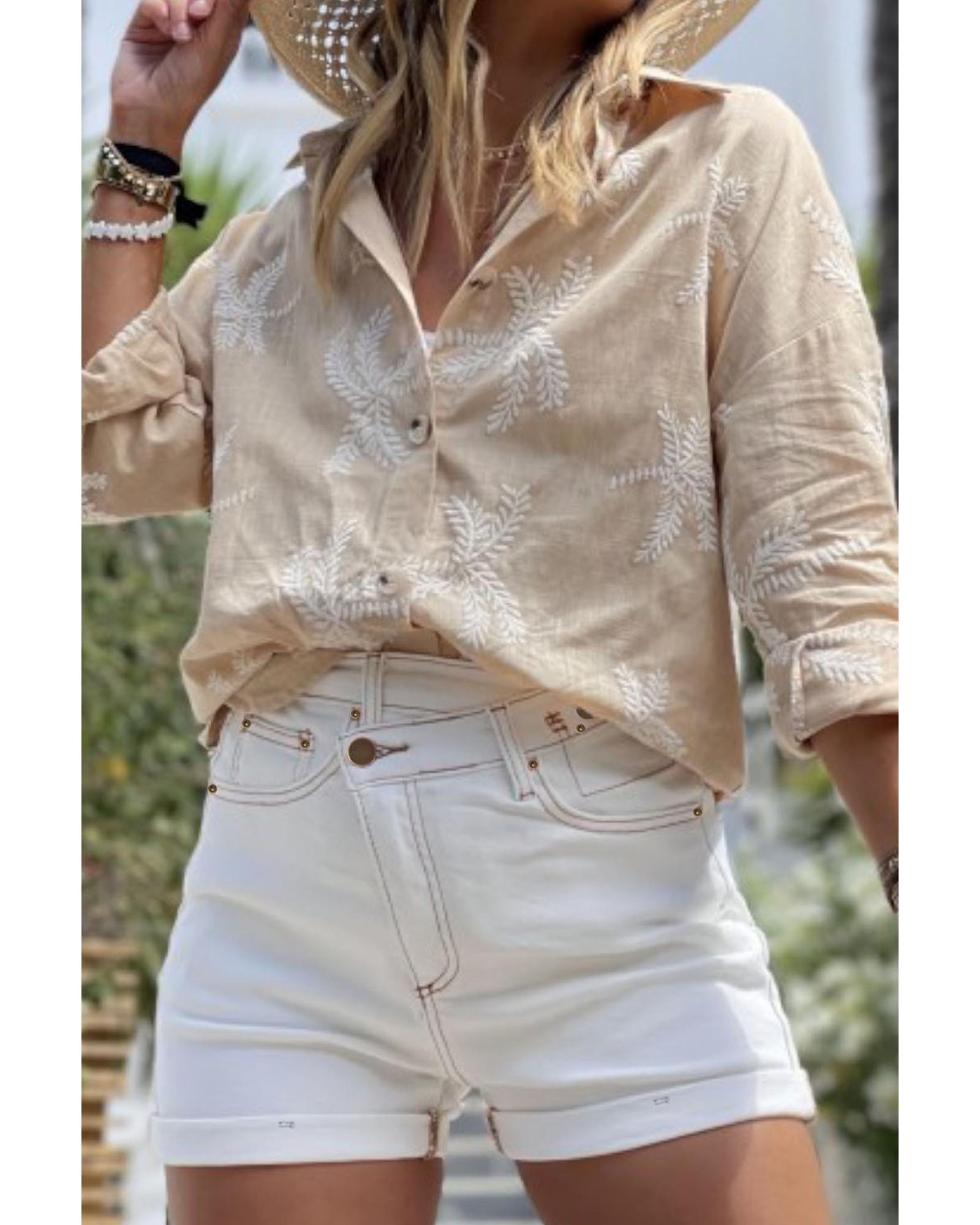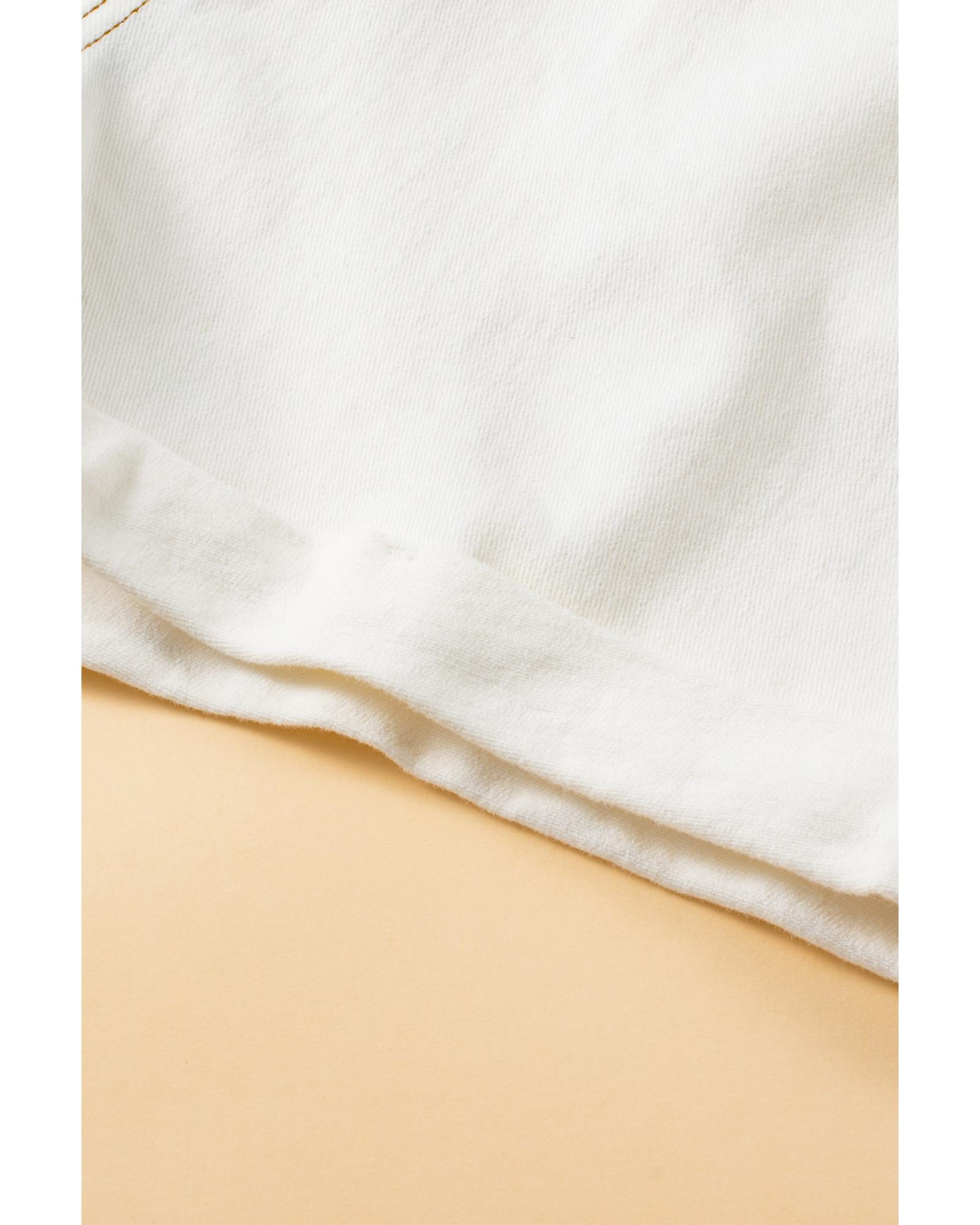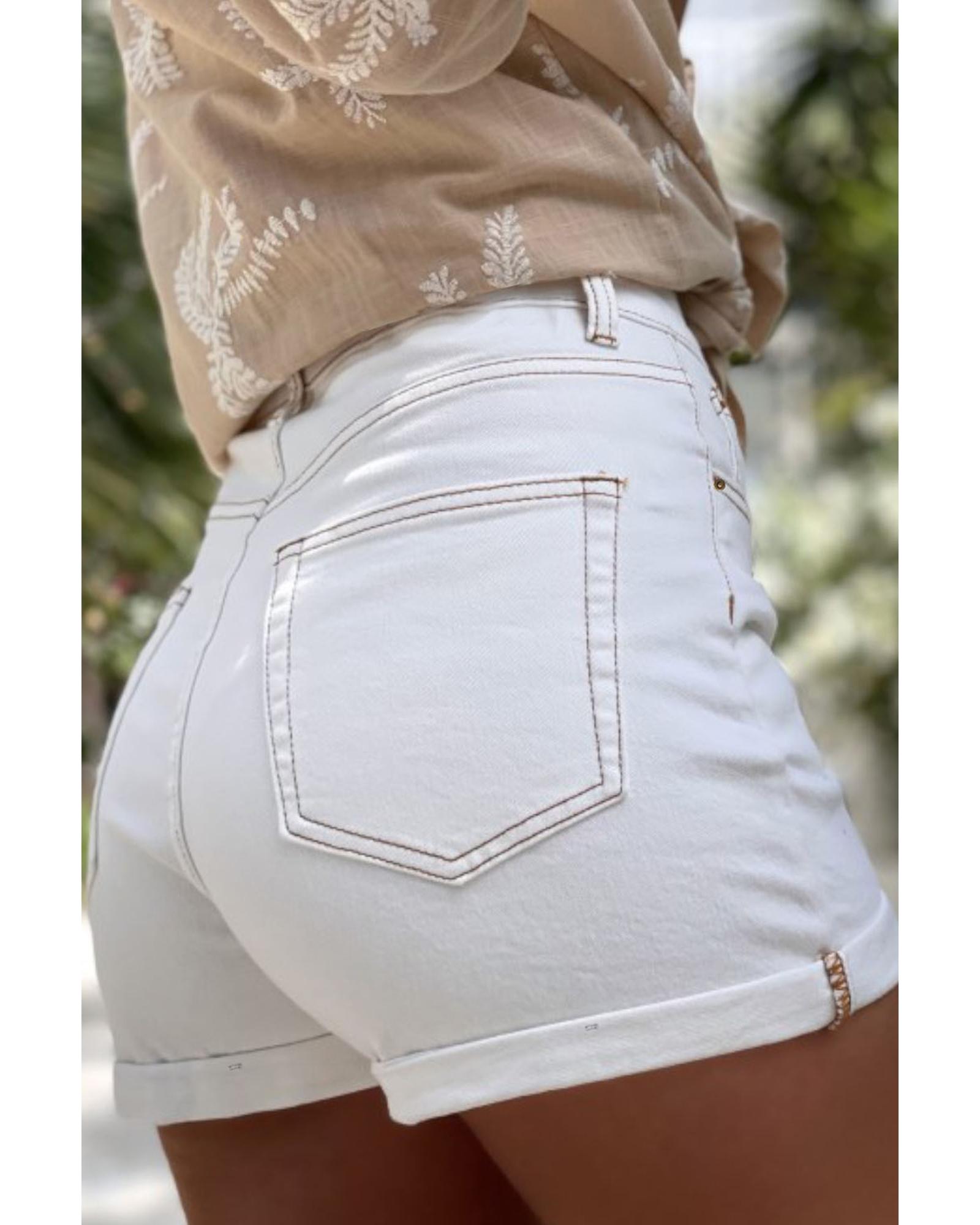 This stylish denim shorts feature a white asymmetric waist design, combining a trendy fitted look with comfort. Made from a blend of cotton and elastane, they offer both durability and flexibility. The classic five-pocket style is complemented by belt loops and a rolled hem, making them suitable for casual and fashionable wear.