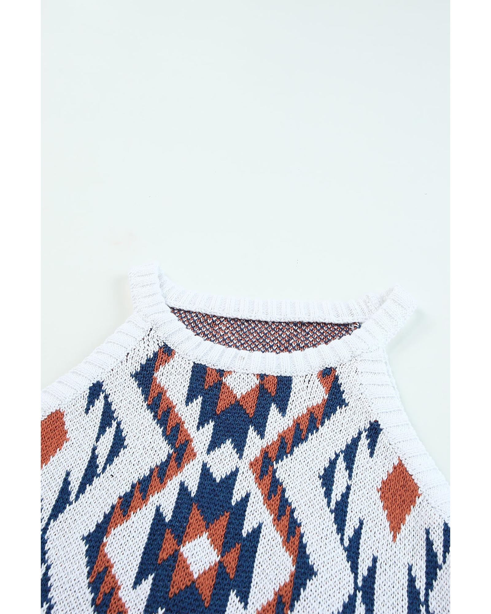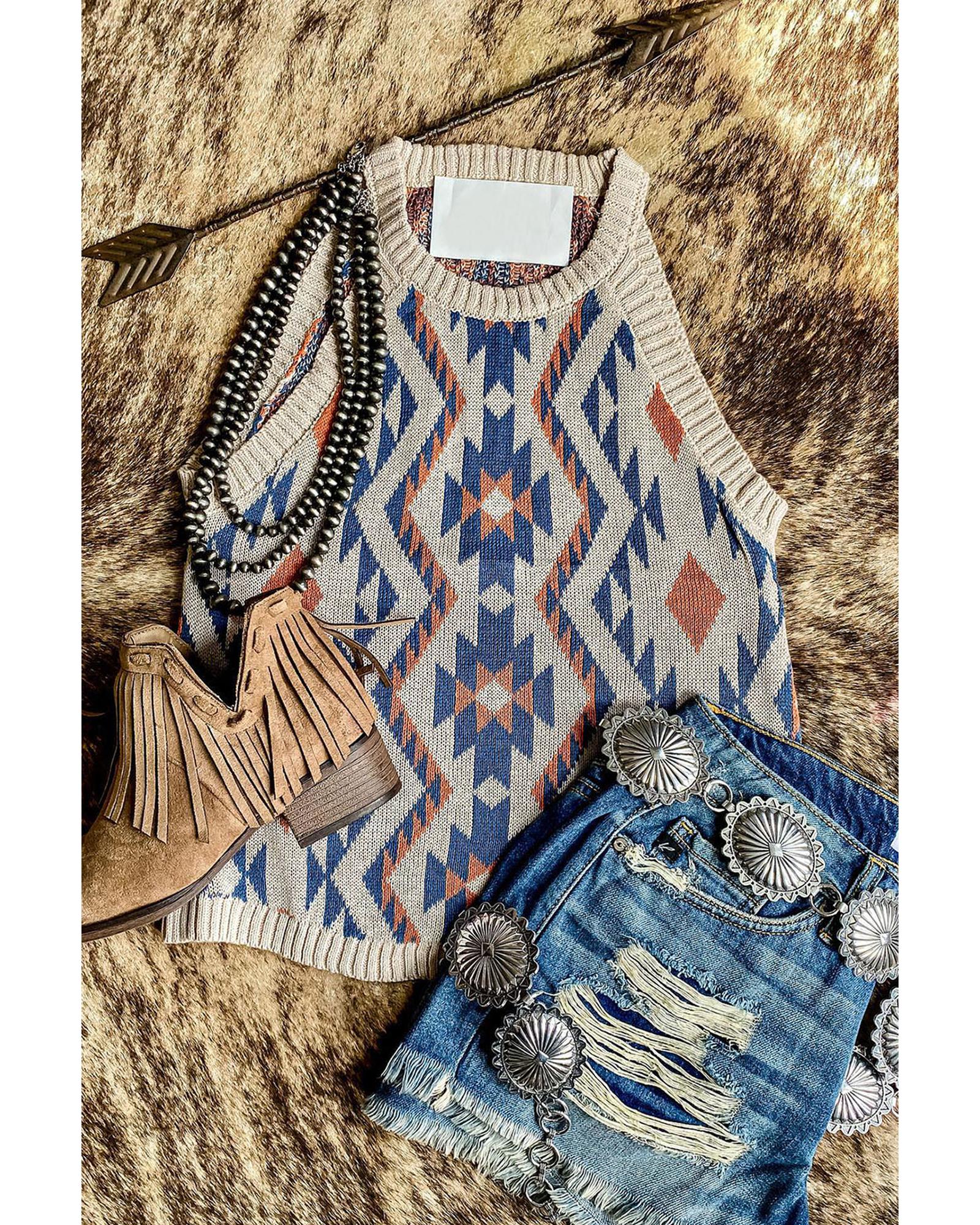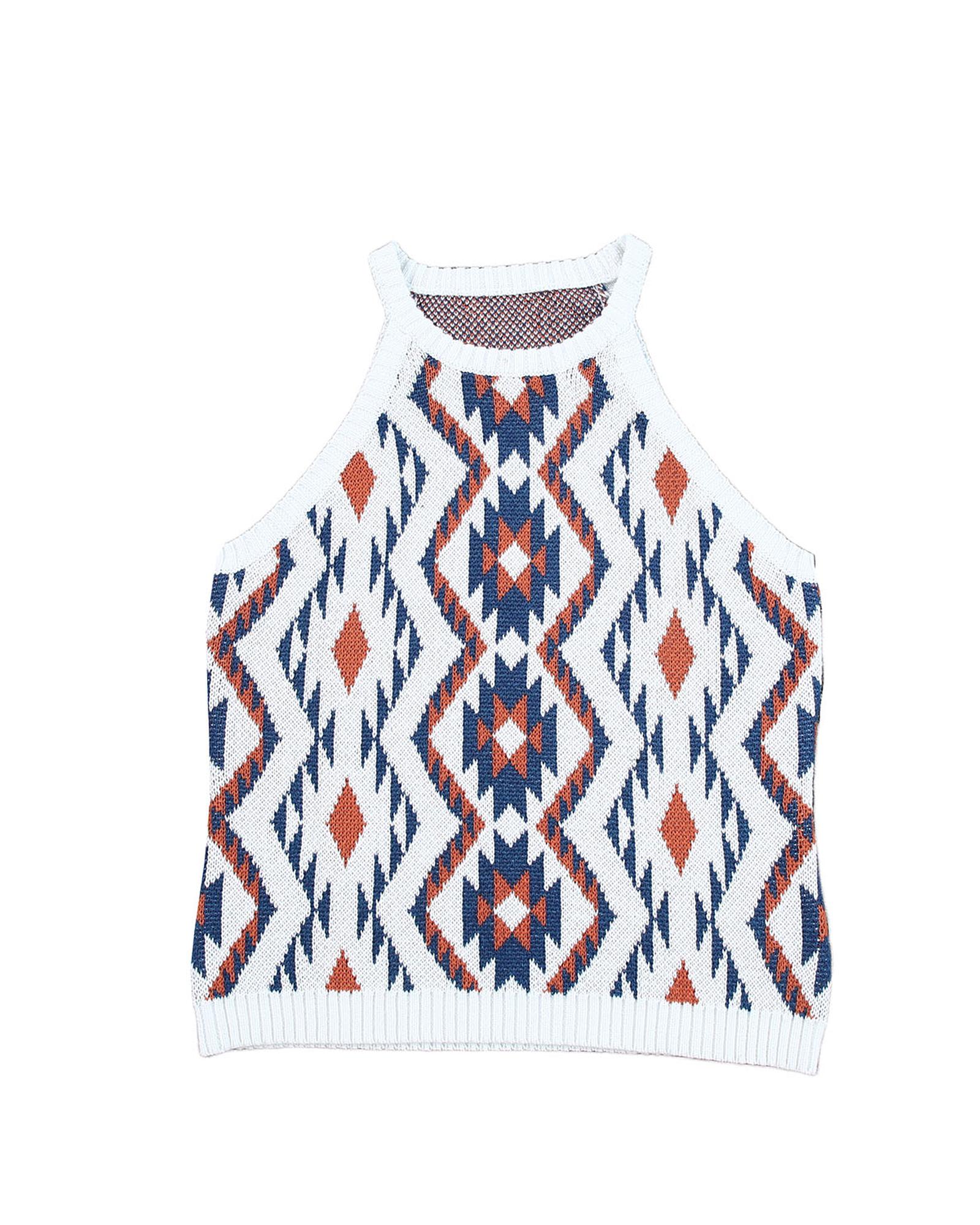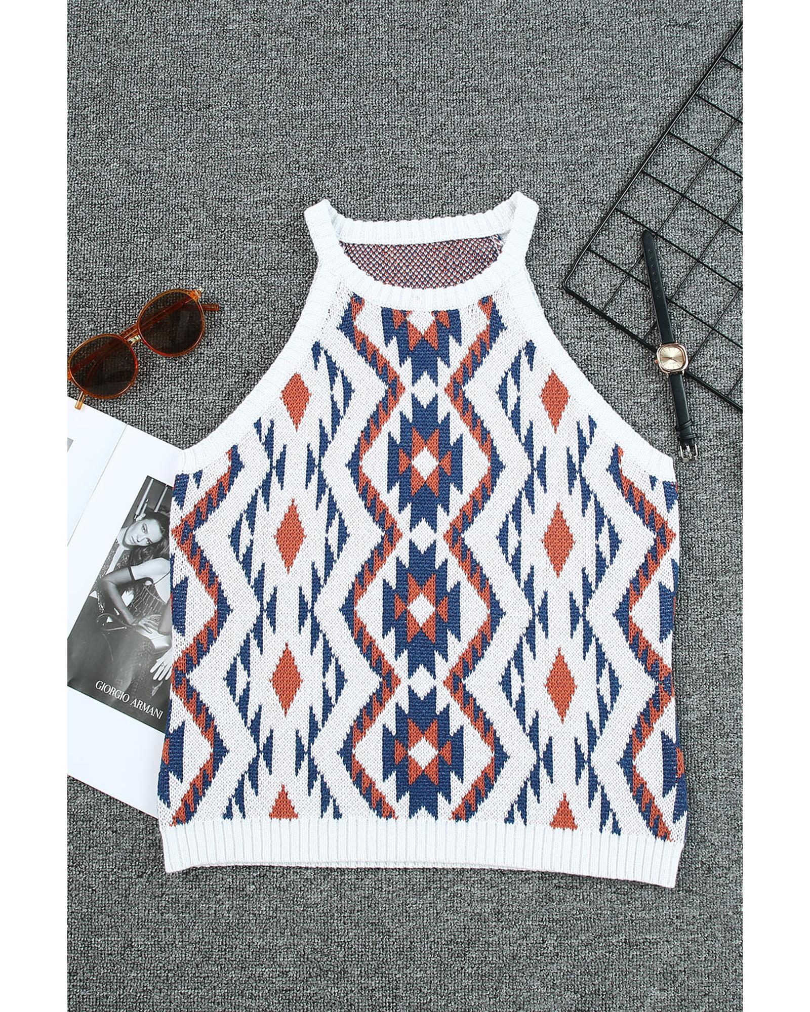 This knitted tank top features a trendy Aztec geometric print, combining style and comfort for various occasions. Its sleeveless design and lightweight material make it suitable for all seasons, whether for fitness, casual outings, or beach days.
