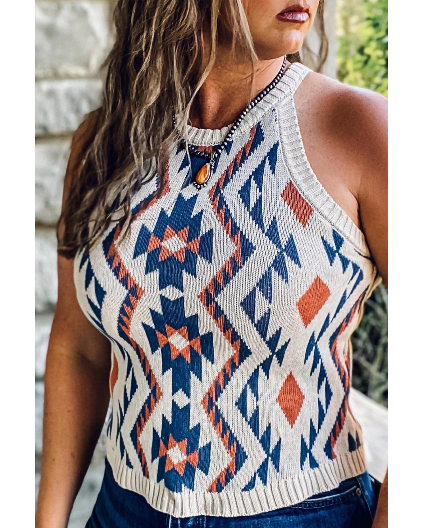 This knitted tank top features a trendy fitted design with a unique boho Aztec geometric print. It is suitable for all seasons and perfect for various occasions such as fitness, parties, beach outings, or daily wear. Made from lightweight and comfortable knitted material, it offers high elasticity for a great fit.