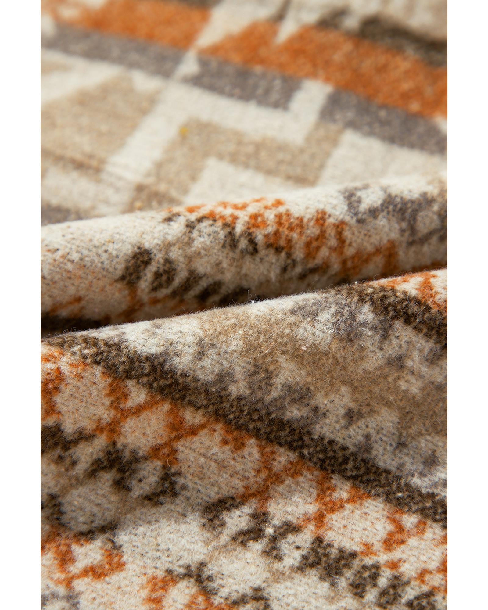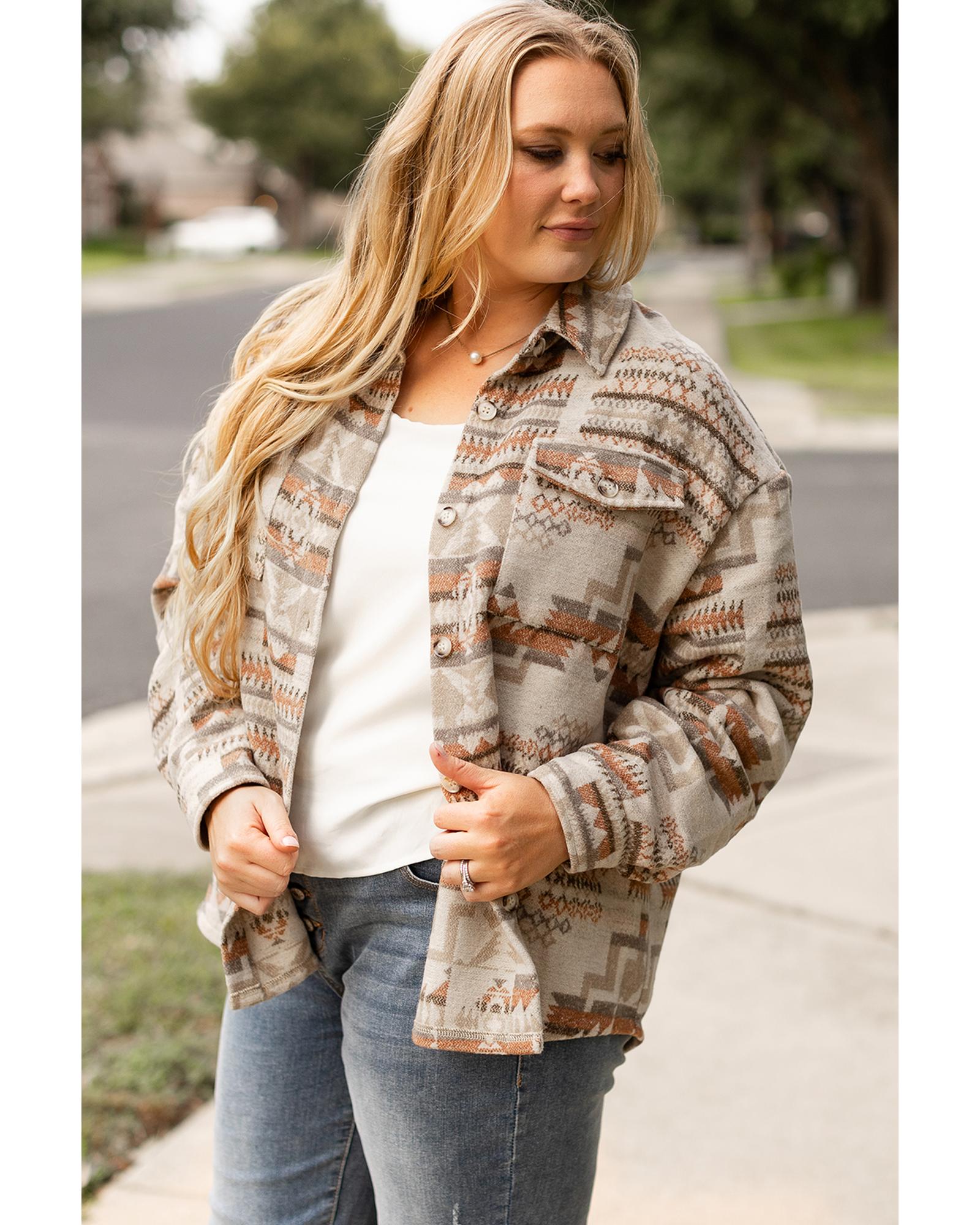 This plus size jacket features a bold white Aztec geometric print, offering a trendy and striking look. Designed with a fitted style, it provides ample room and flexibility for comfortable wear. Practical pockets and a button-up front add convenience and ease of use.
