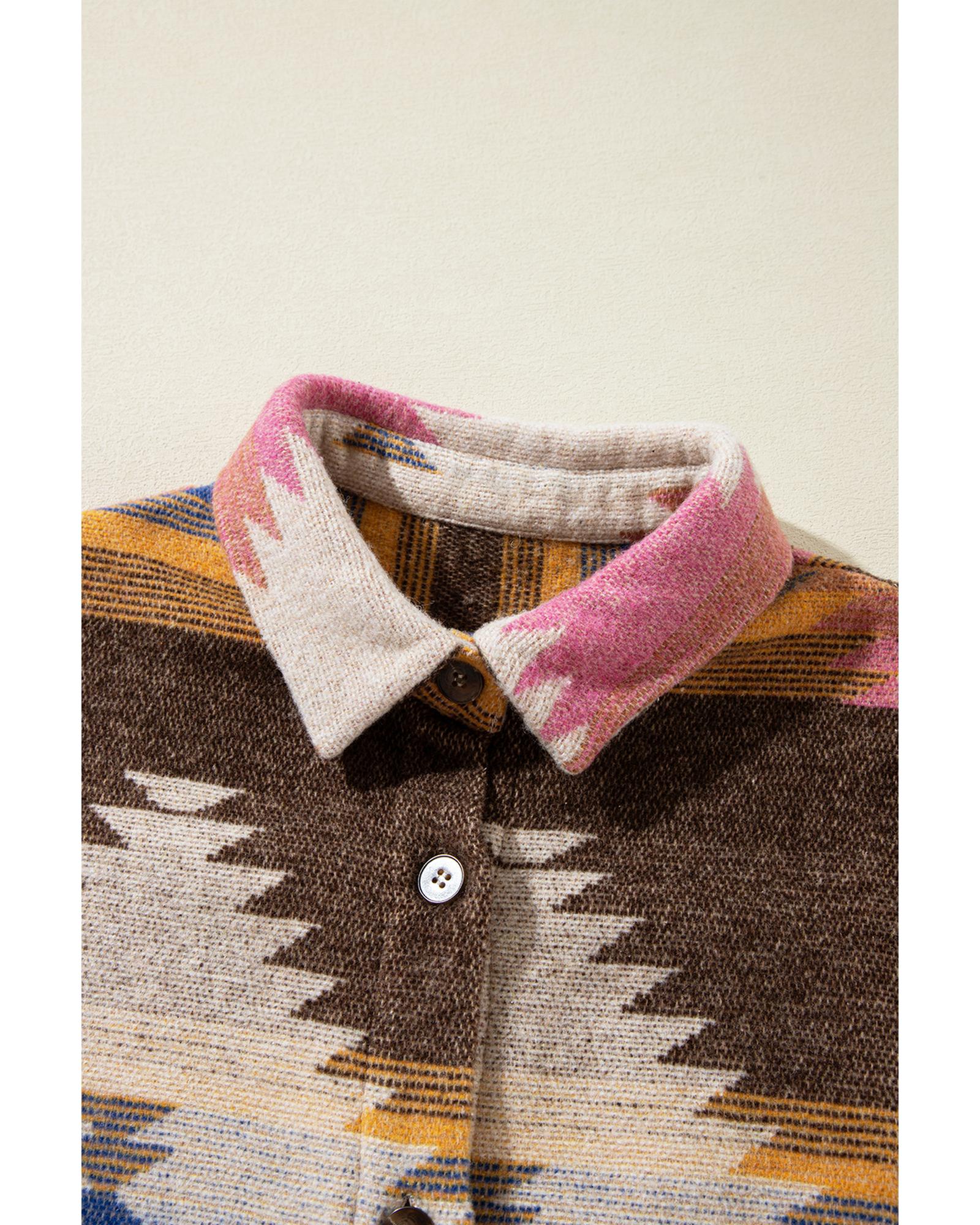 This shacket features a vibrant Aztec print that adds a touch of cultural richness to your wardrobe. Its button-up design offers versatile styling options, making it suitable for layering or wearing open. Perfect for transitioning from casual to smart looks, it pairs well with jeans to highlight the unique print.