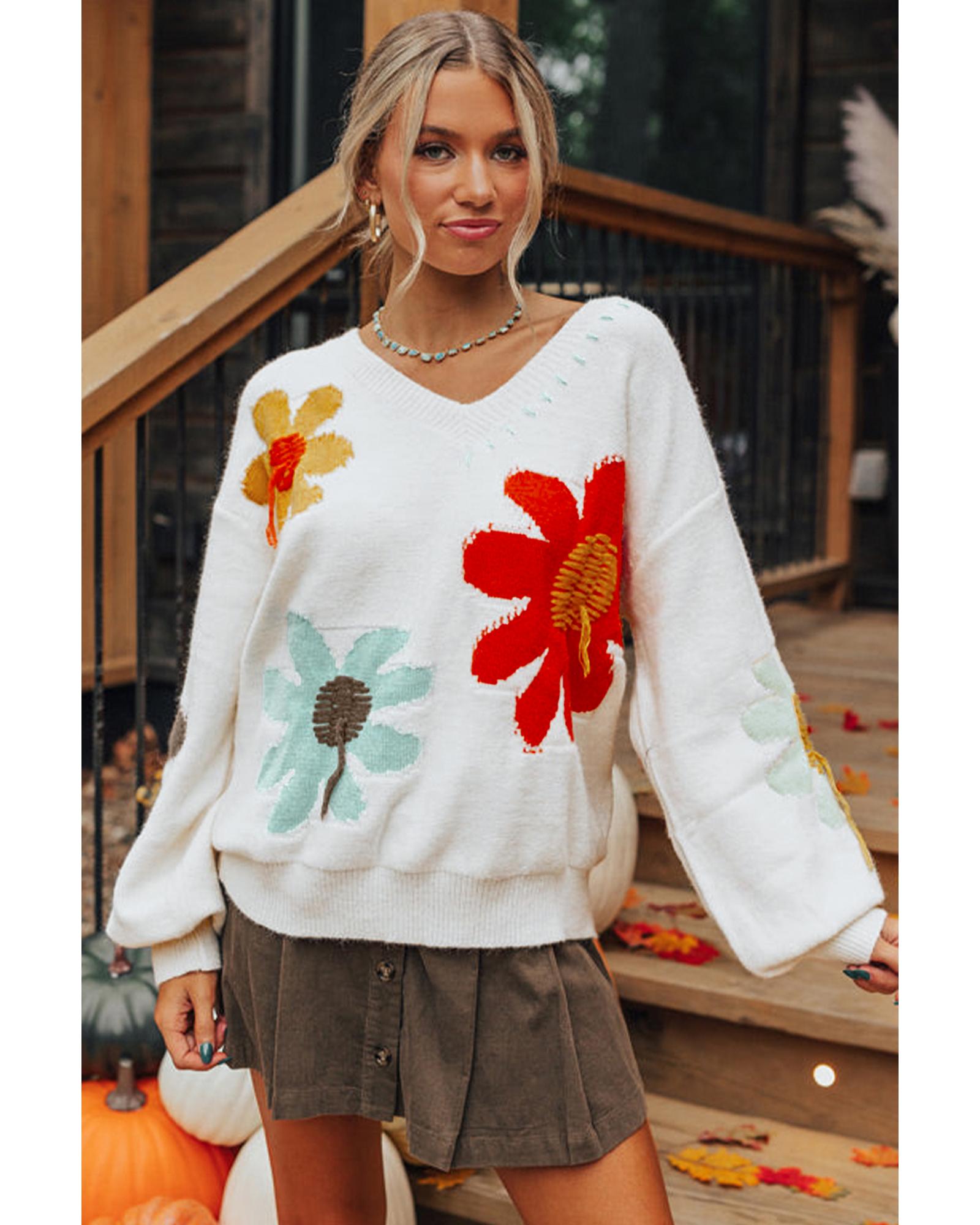 White Big Flower Pattern V Neck Drop Shoulder Sweater – S