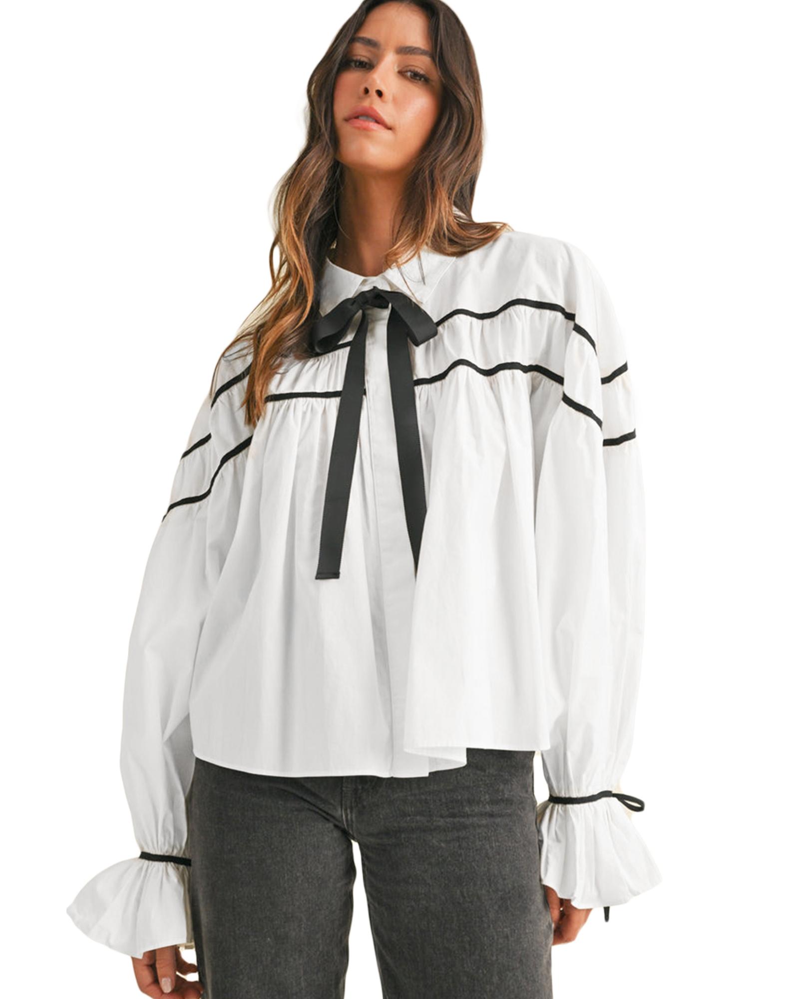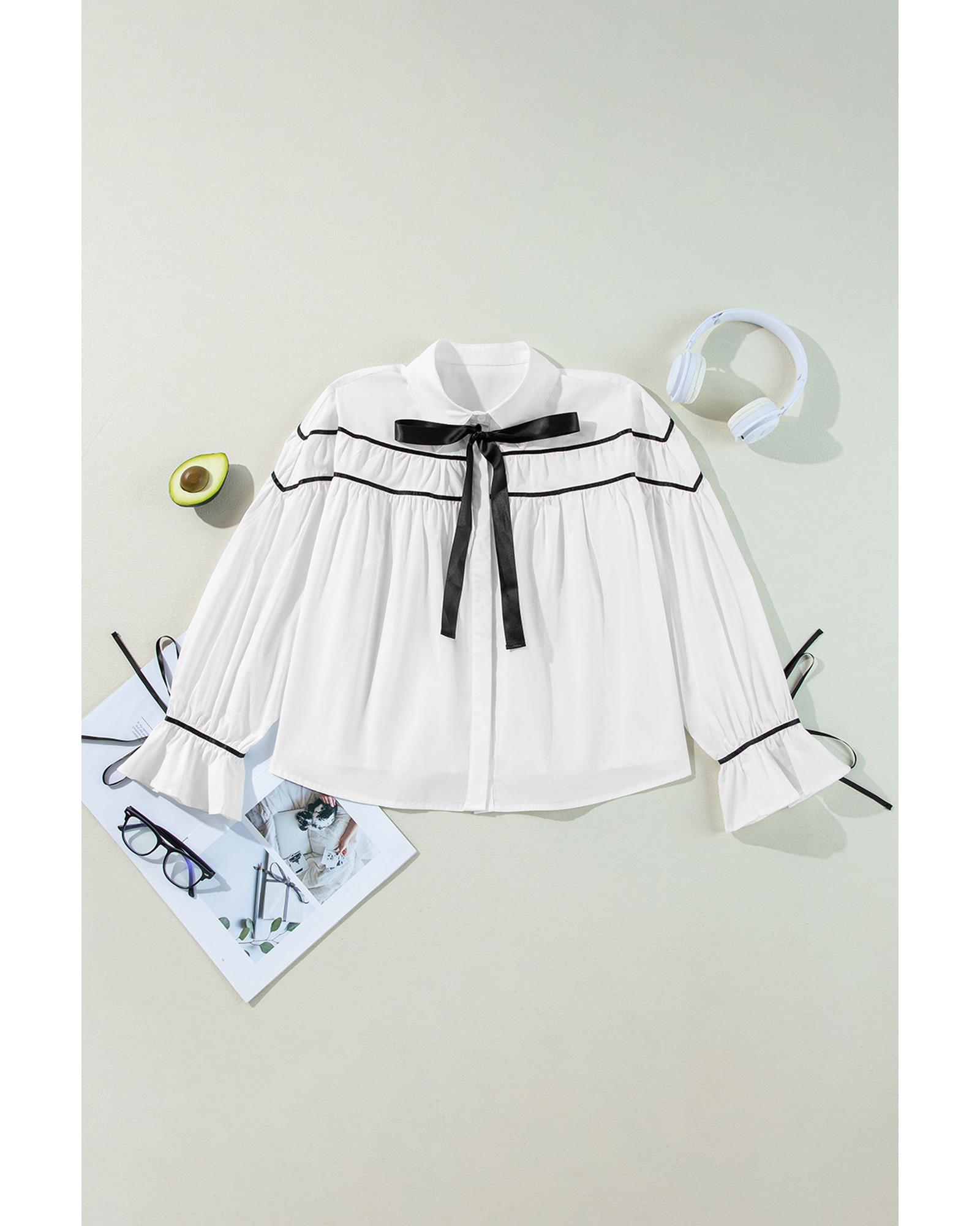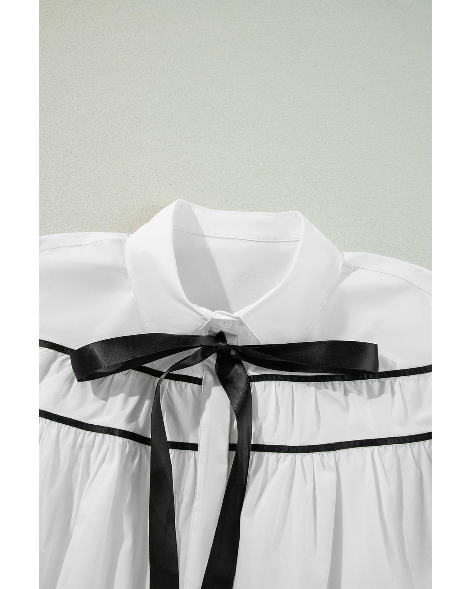 This stylish shirt features a trendy fitted design with a contrast pipping detail that creates a striking color block visual. The collared neckline offers a modest and elegant appearance, complemented by a ribbon bowtie that adds a feminine and graceful touch. Ruffled puff sleeves enhance the overall elegance, making it suitable for both daily wear and dressy occasions.