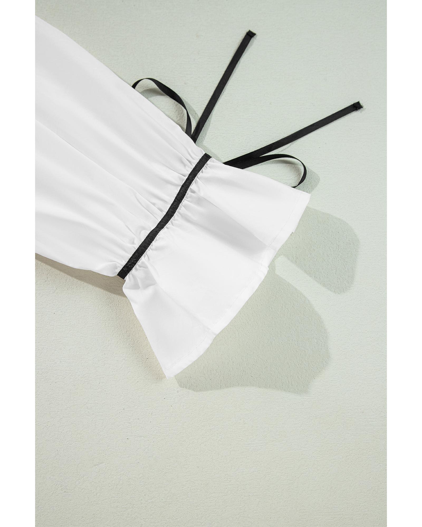 White Black Pipping Ribbon Bowtie Collared Ruffled Puff Sleeve Shirt – L