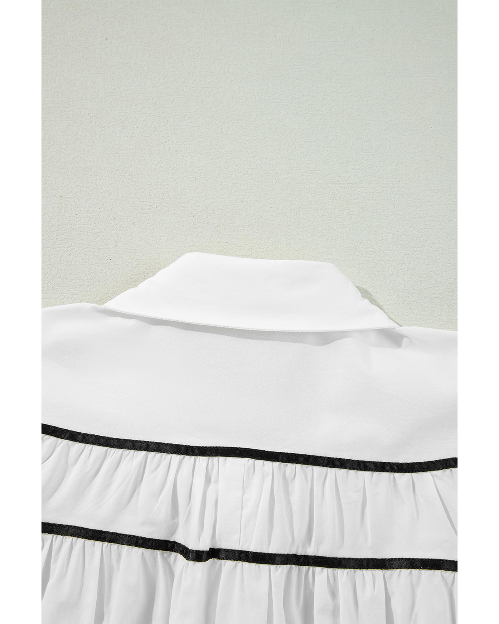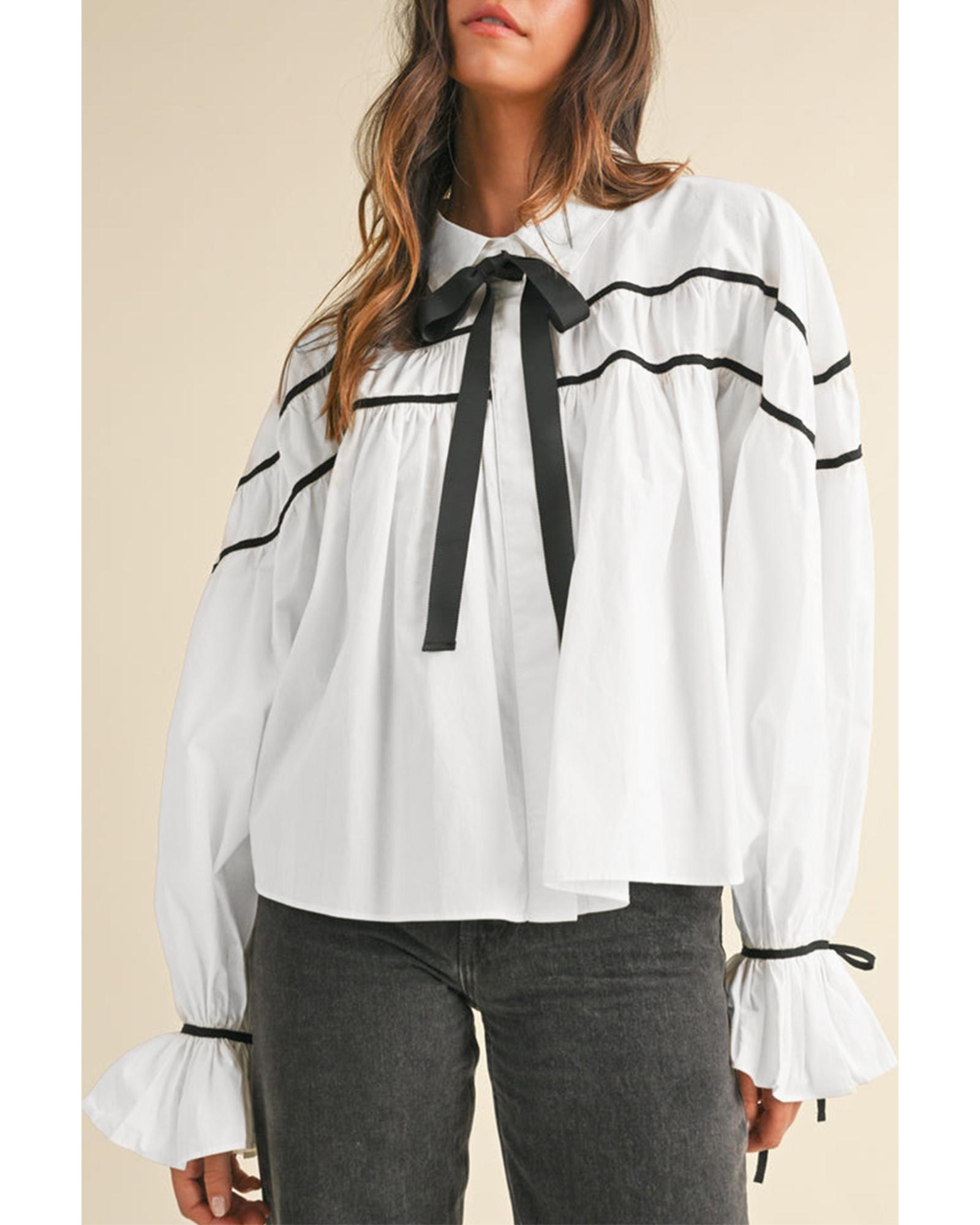 This stylish shirt features a trendy fitted design with a contrast pipping detail that creates a striking color block visual. The collared neckline offers a modest and elegant appearance, complemented by a ribbon bowtie that adds a feminine and graceful touch. Ruffled puff sleeves enhance the overall elegance, making it suitable for both daily wear and dressy occasions.