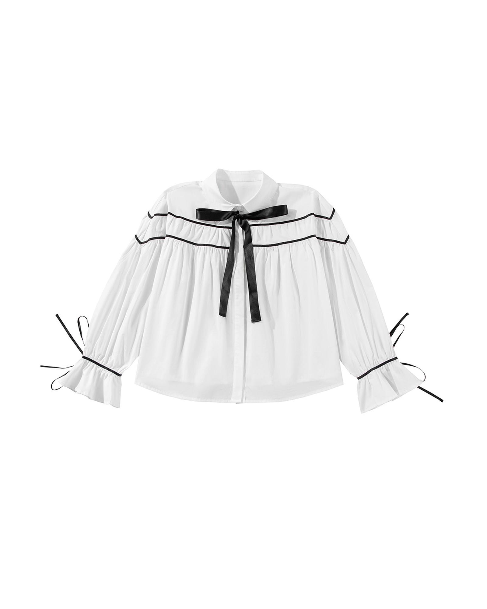 White Black Pipping Ribbon Bowtie Collared Ruffled Puff Sleeve Shirt – M