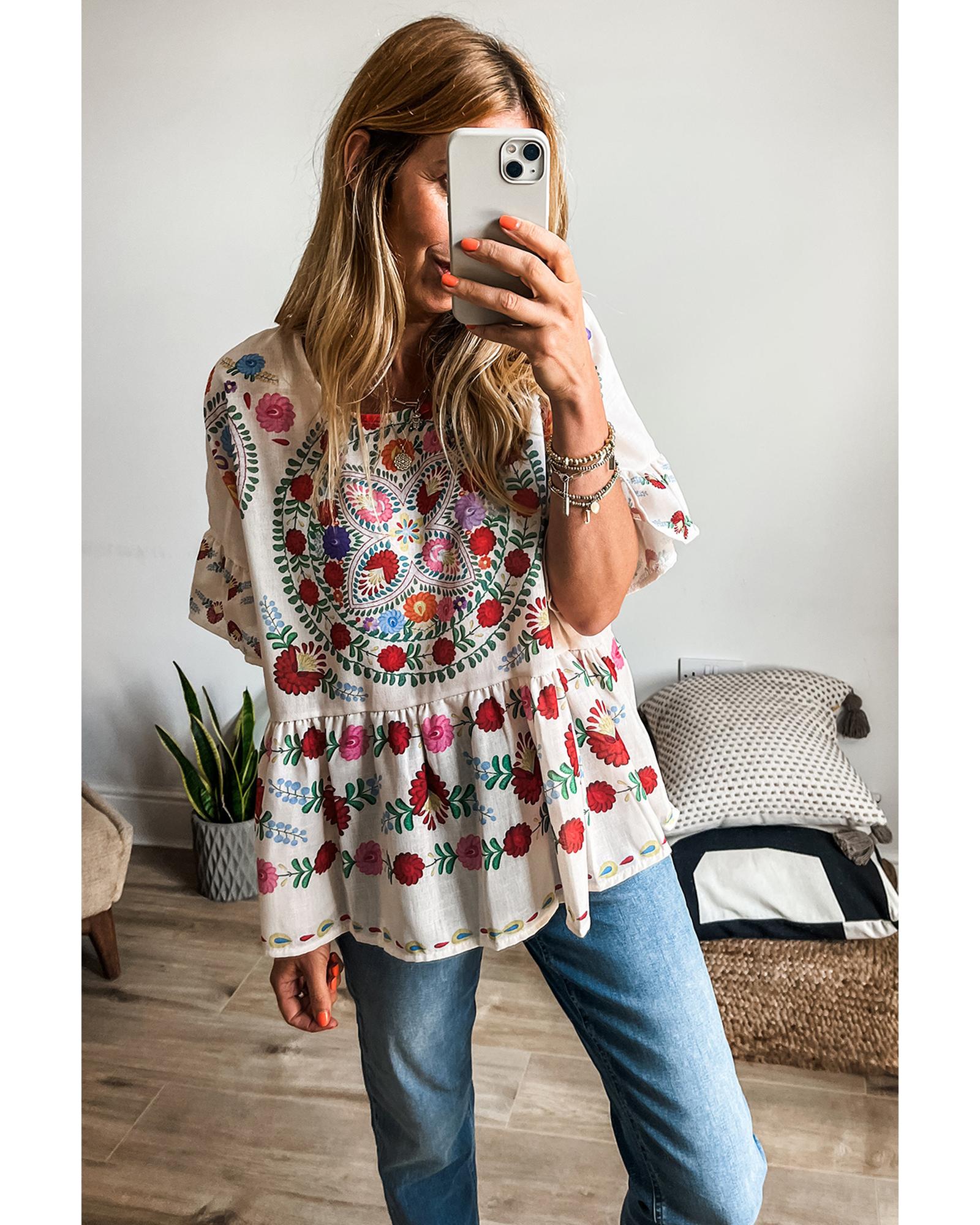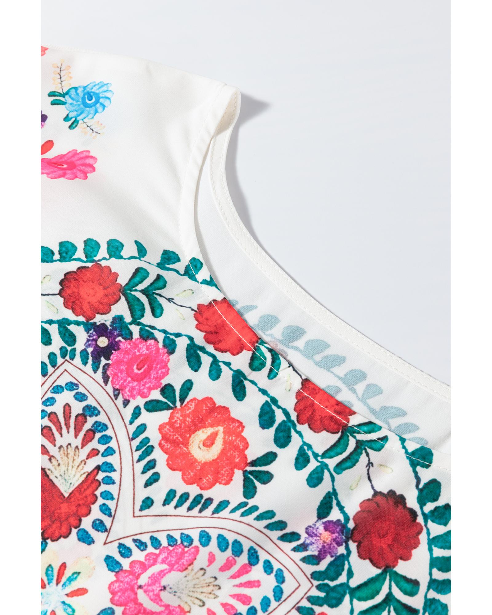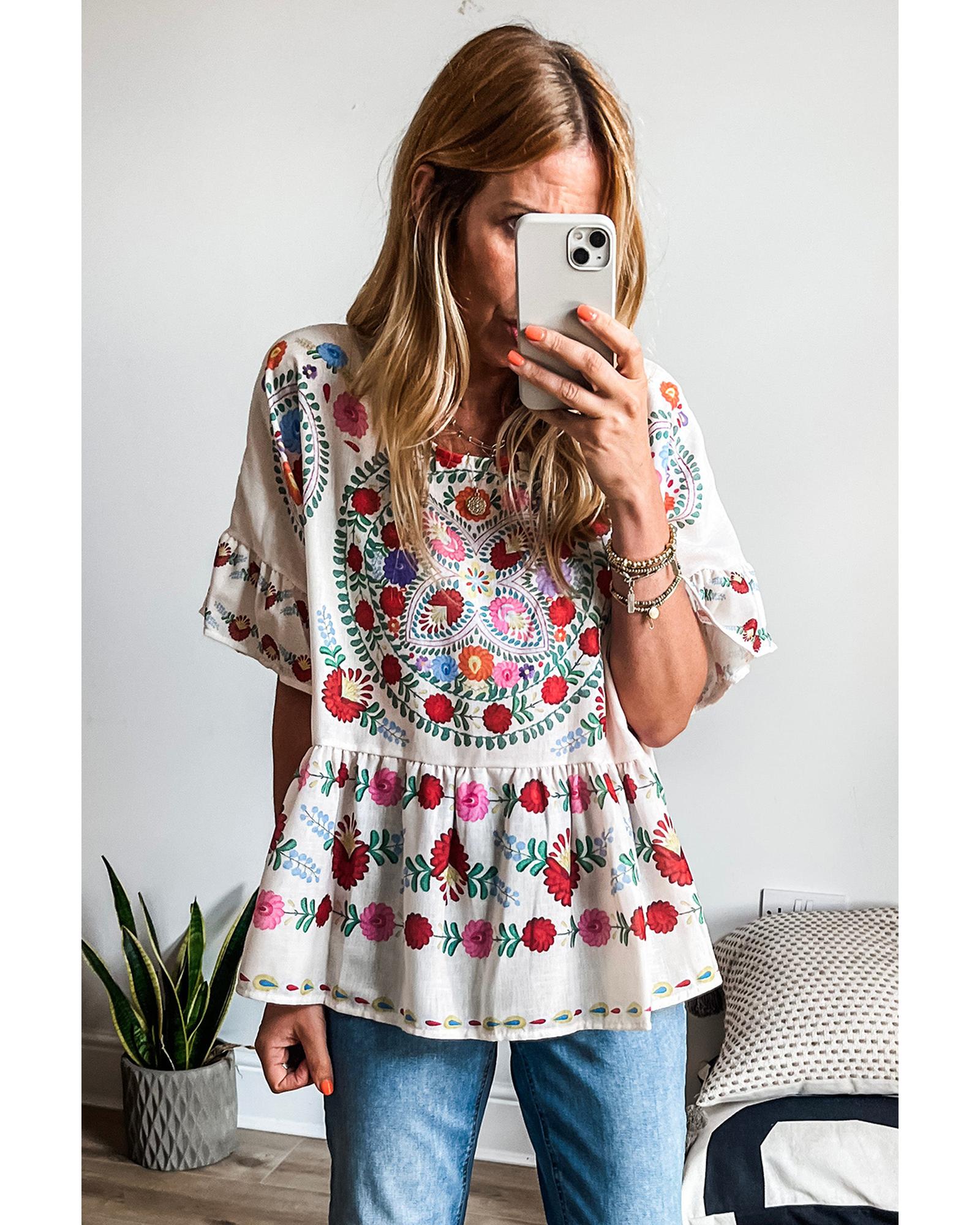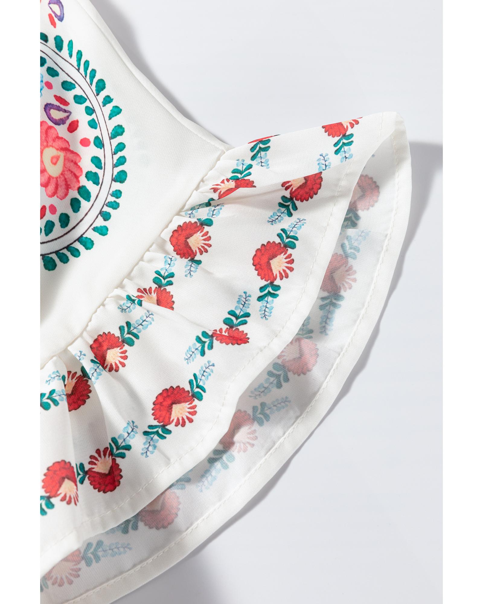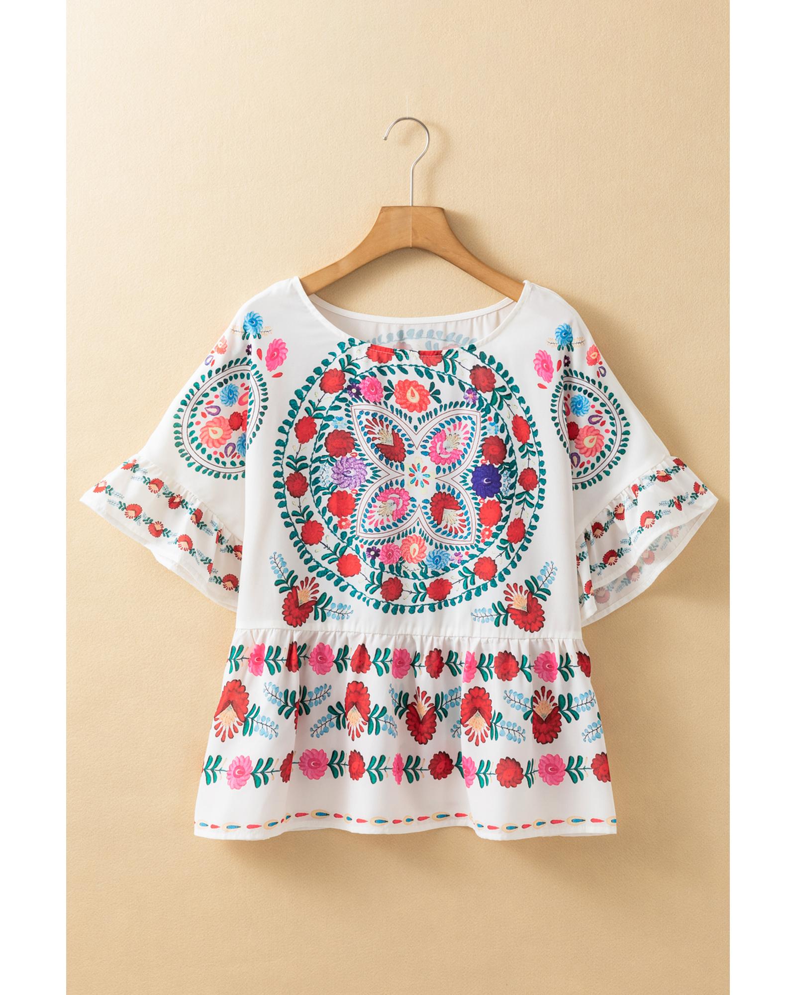 White Boho Floral Print Round Neck Ruffle Trim Blouse – S